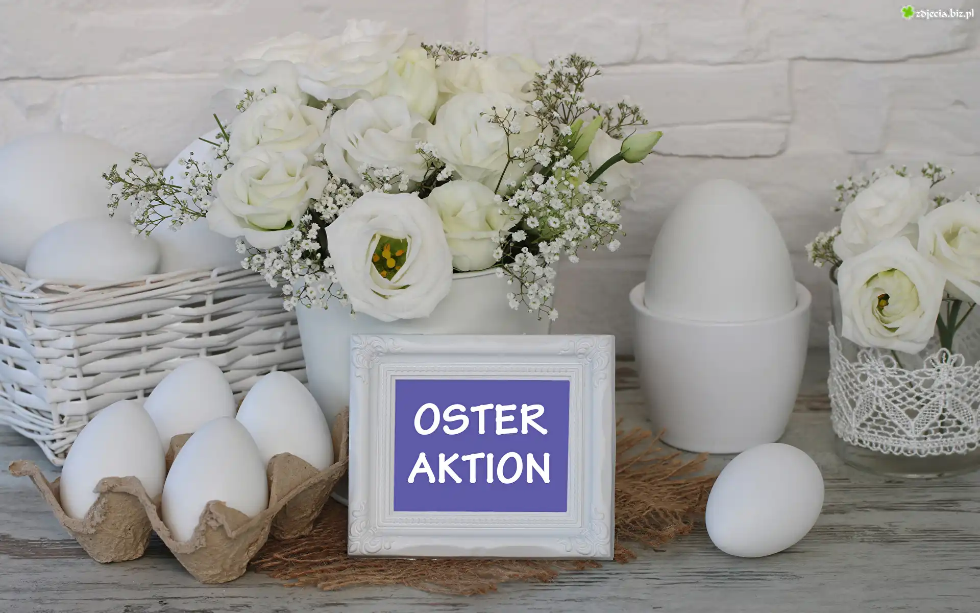 Zdjęcie Wielkanoc, Jajka, Białe, Kwiaty, Eustoma, Koszyczki, Napis