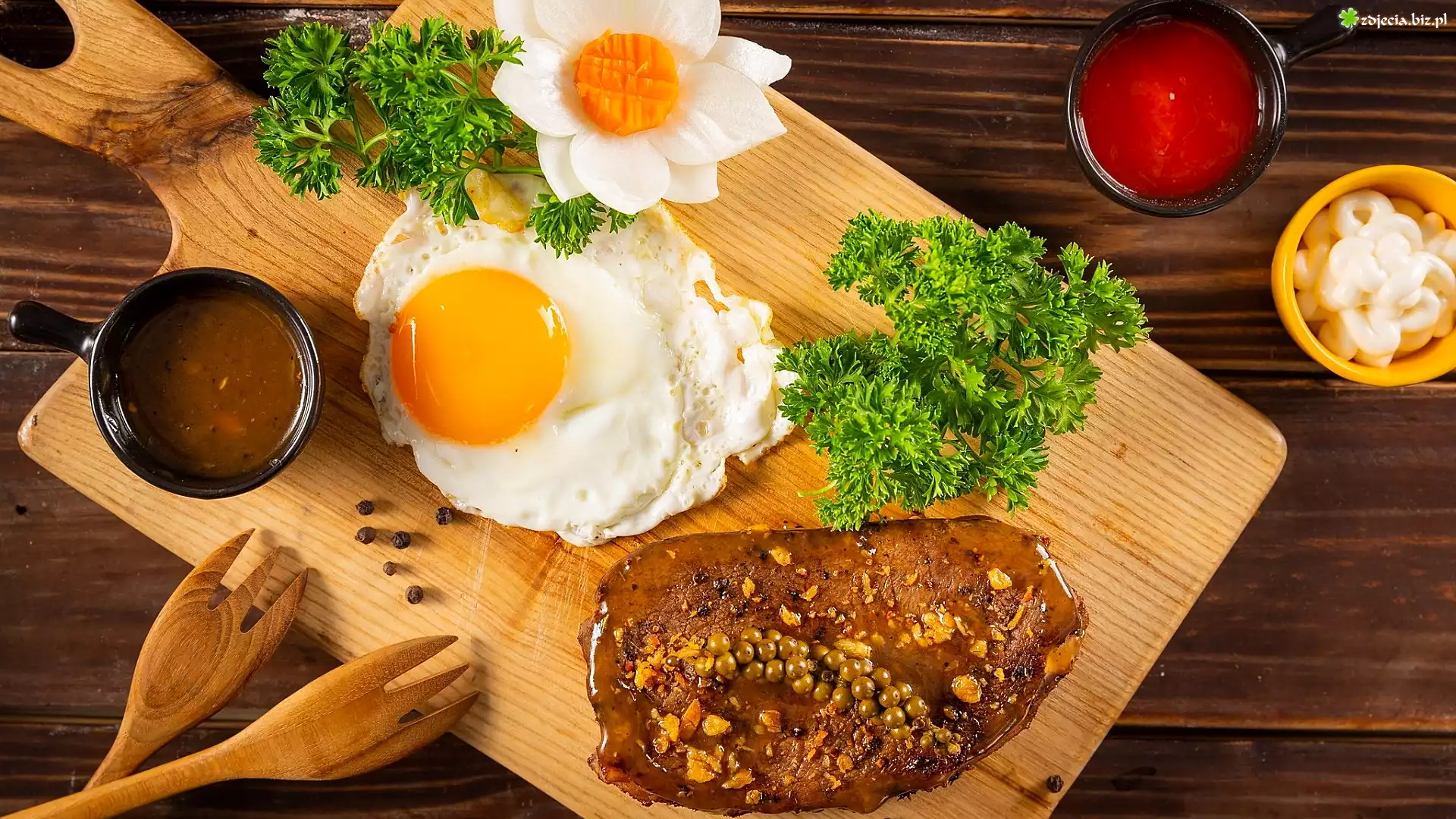 Zdjęcie Deska, Stek, Jajko, Sadzone, Zielenina, Kwiatek, Sos, Keczup, Majonez, Drewniane, Widelce