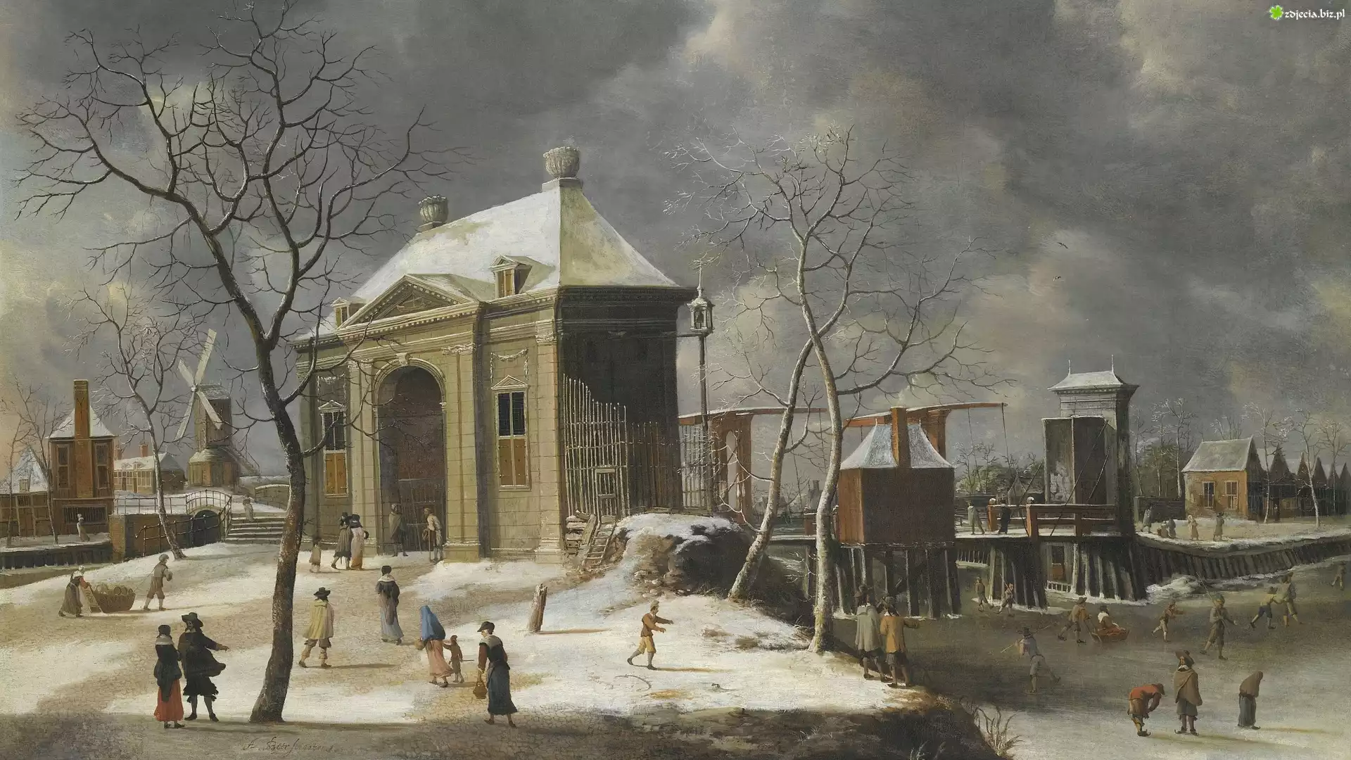 Zdjęcie Malarstwo, Obraz, Jan Abrahamsz Beerstraaten, Zima, Amsterdam, Brama, Rzeka, Ludzie, Łyżwy