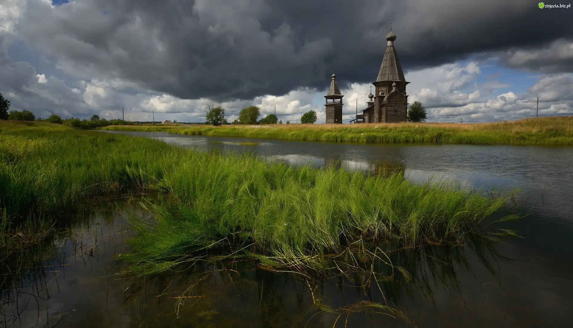 Zdjęcie Cerkiew Świętego Jana Chryzostoma, Rzeka Onega, Trawa, Drzewa, Kiprovo, Obwód archangielski, Rosja |