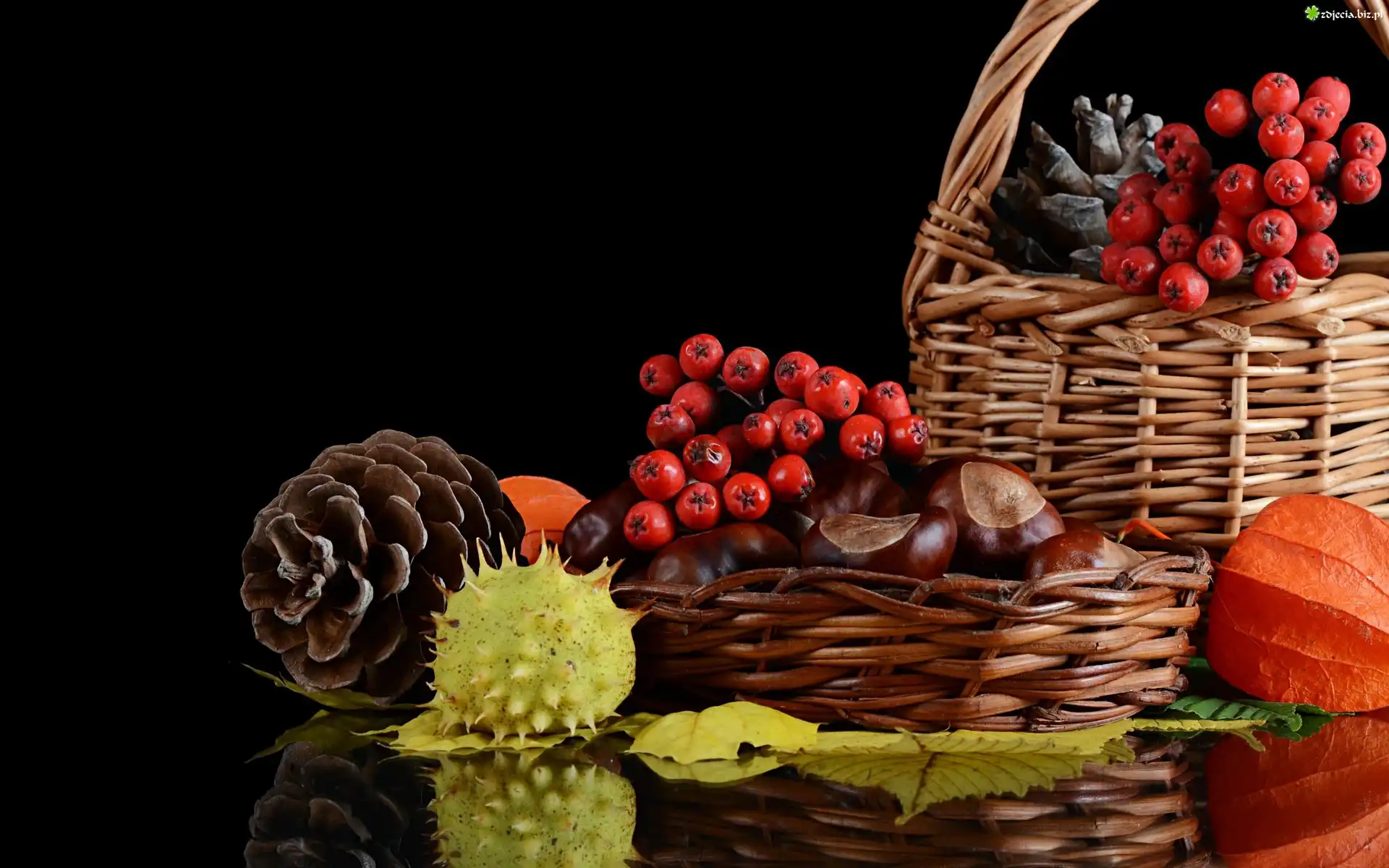 Zdjęcie, Kasztany, Jarzębina, Szyszki, Kosze, Jesienne, Zbiory, Kompozycja