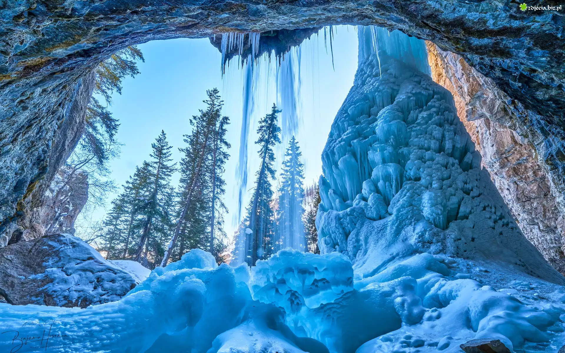Zdjęcie Stany Zjednoczone, Kolorado, Jaskinia, Sople, Drzewa, Zima
