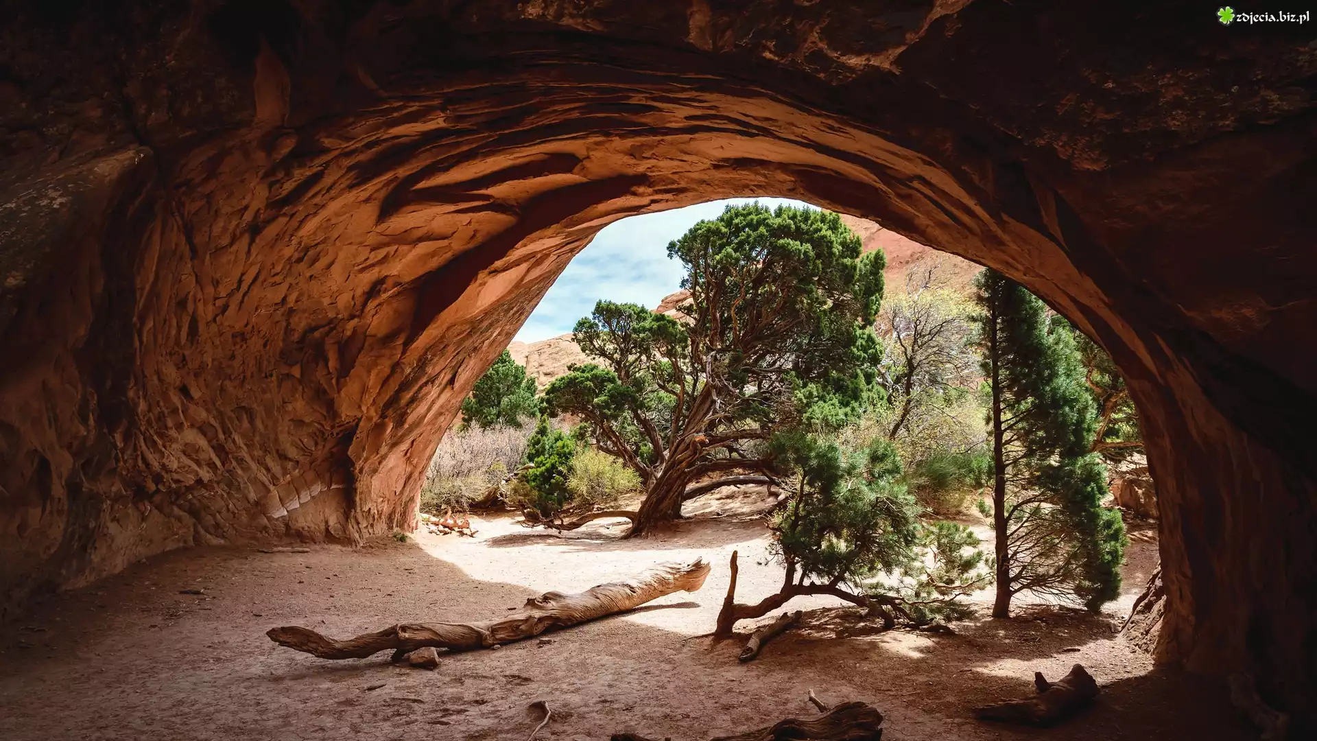 Zdjęcie Jaskinia, Skały, Drzewa, Sosny, Park Narodowy Arches, Utah, Stany Zjednoczone