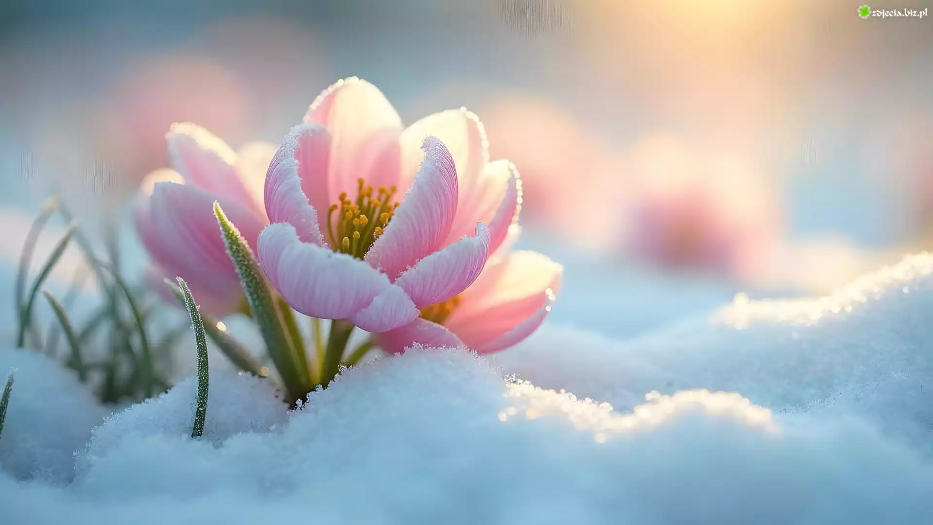 Zdjęcie Kwiaty, Jasnoróżowe, Zima, Śnieg, Światło