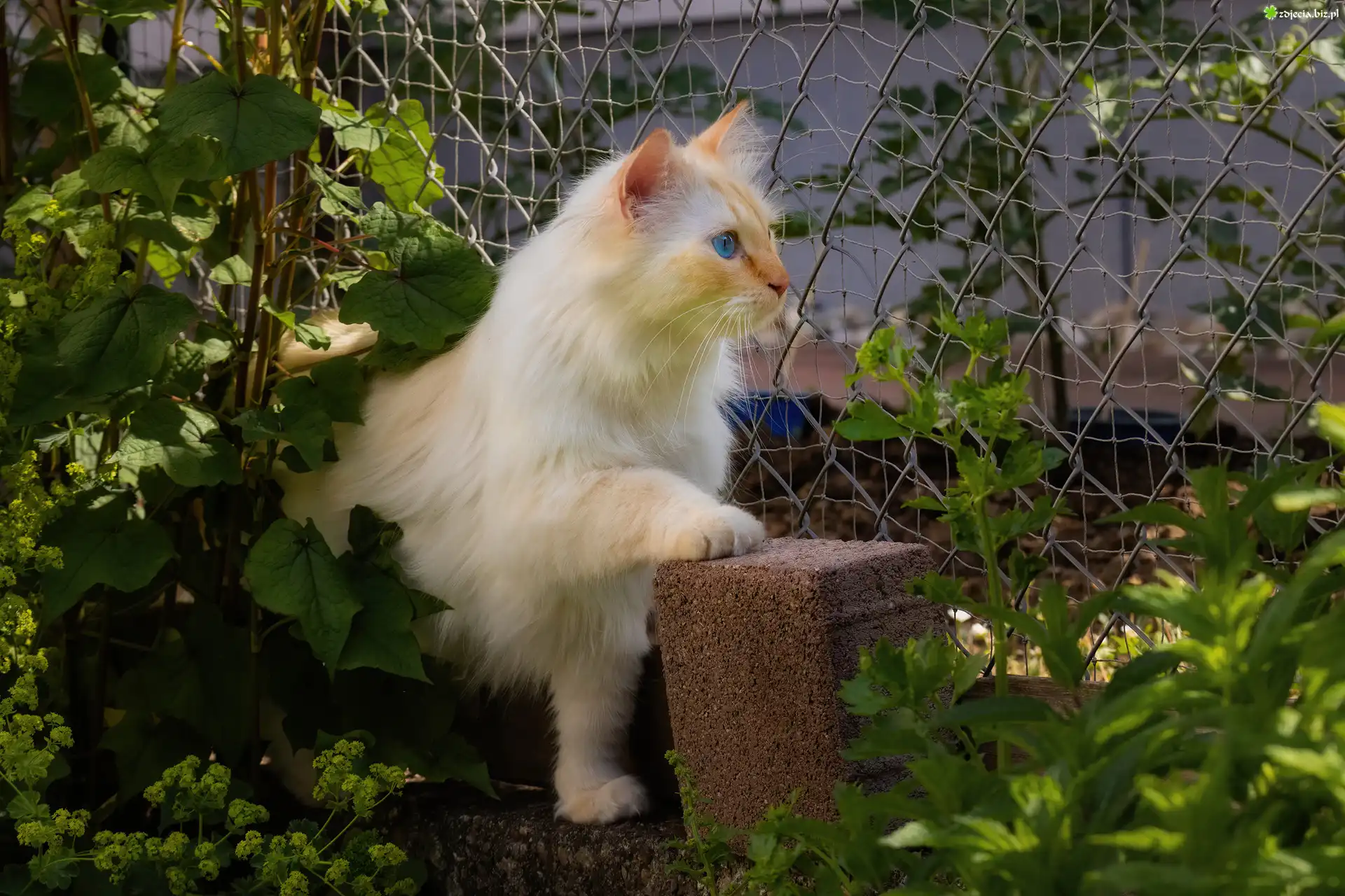 Zdjęcie, Kot, Jasnorudy, Niebieskie, Oczy, Ogrodzenie, Siatka, Pustak, Rośliny