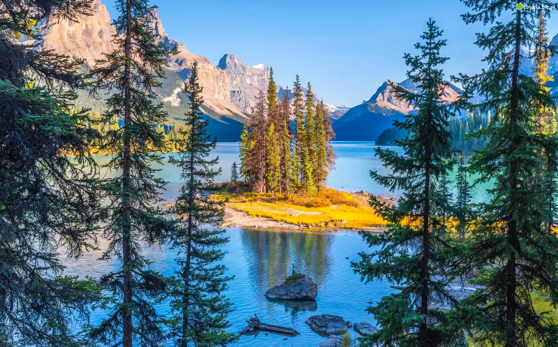 Zdjęcie Kanada, Park Narodowy Jasper, Góry, Jezioro Maligne Lake, Wyspa Spirit Island, Drzewa, Alberta |