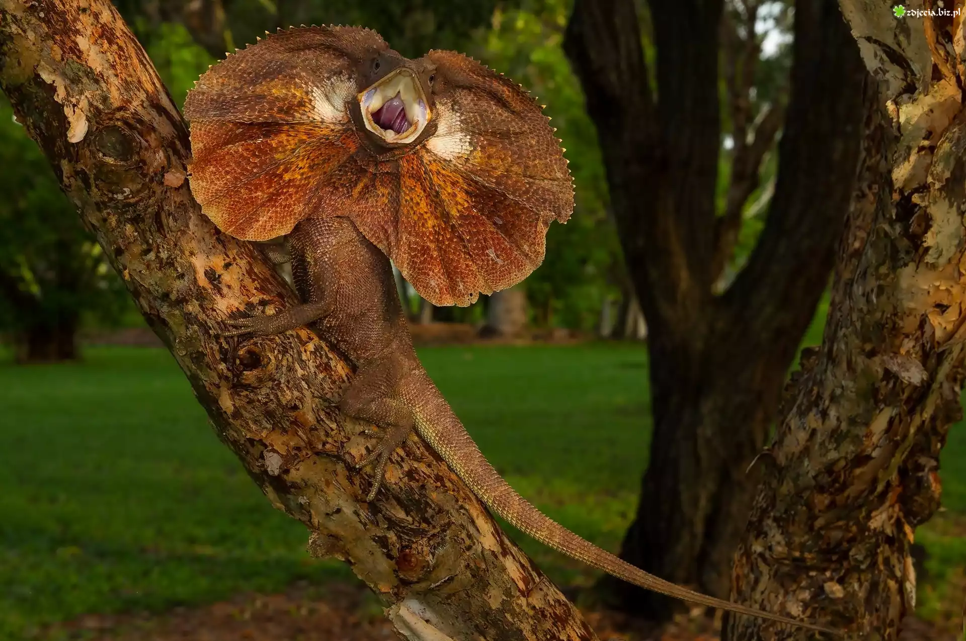 Zdjęcie, Jaszczurka, Agama, Wachlarz, Drzewo