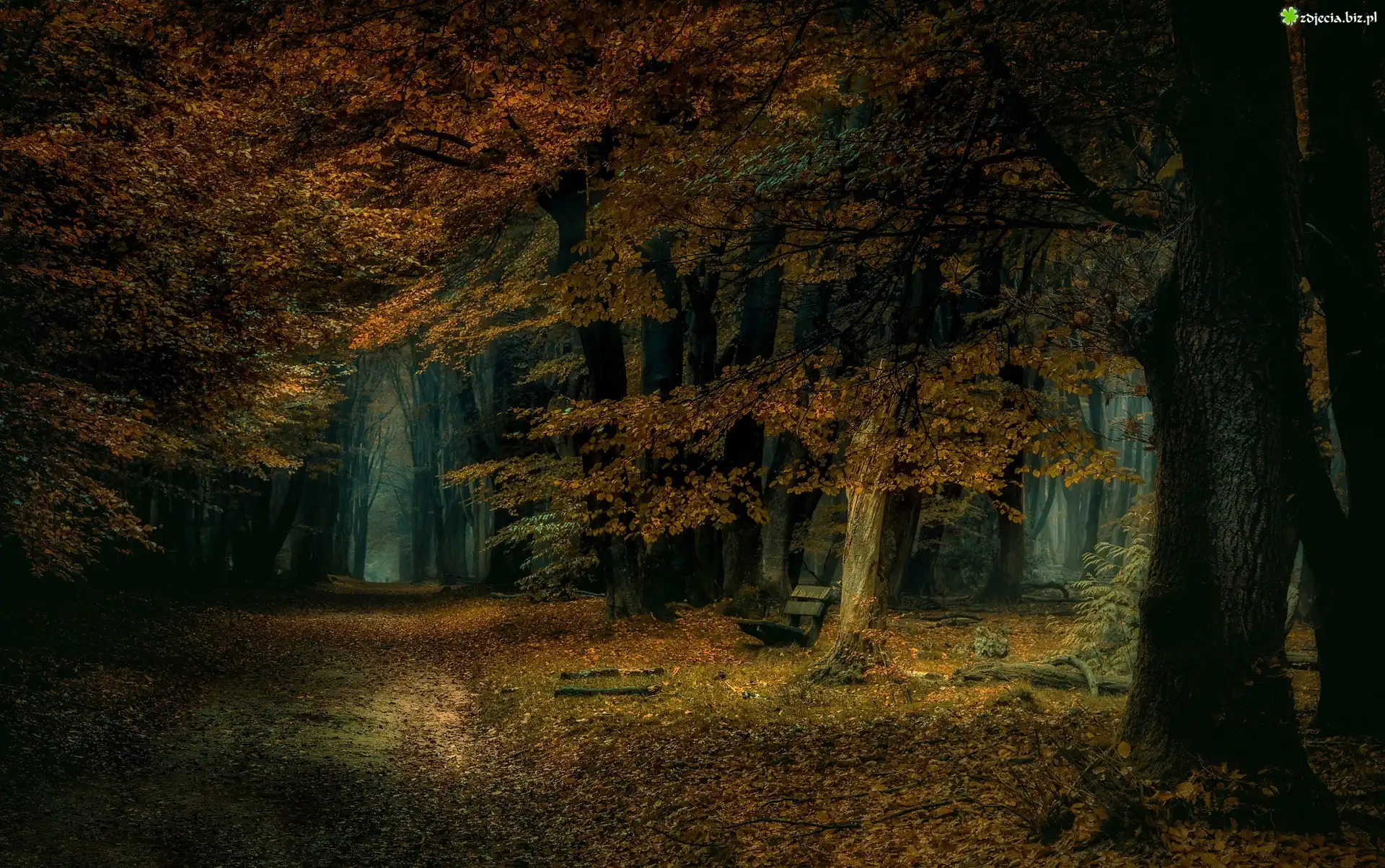 Zdjęcie Jesień, Park, Drzewa, Ścieżka, Ławka, Liście