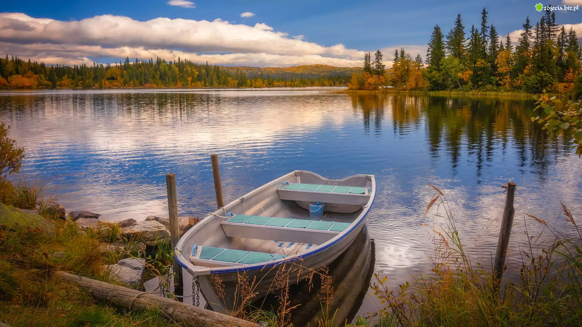 Zdjęcie Jesień, Jezioro, Lasy, Brzeg, Łódka