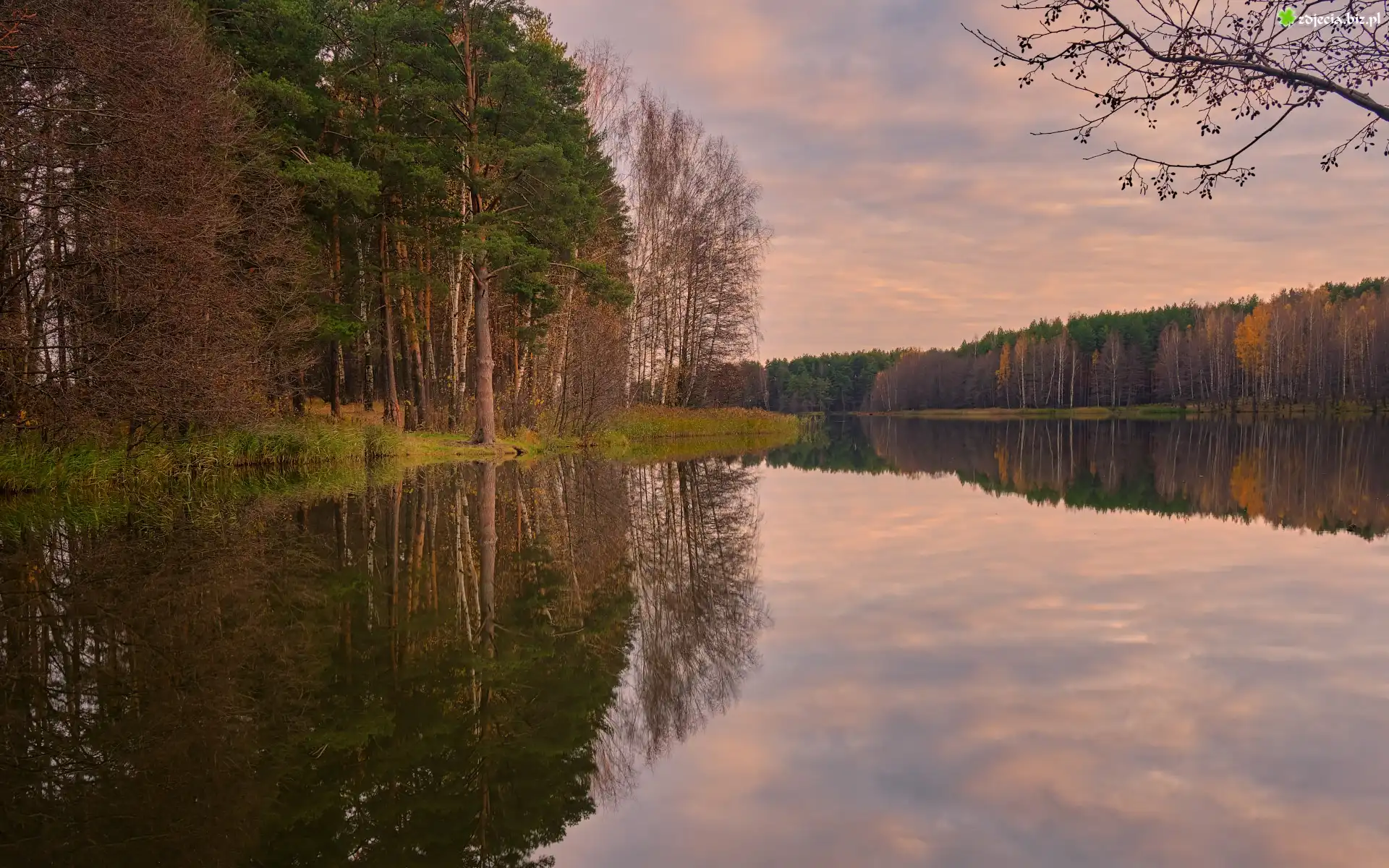 Zdjęcie, Jesień, Jezioro, Las, Drzewa, Brzozy, Odbicie
