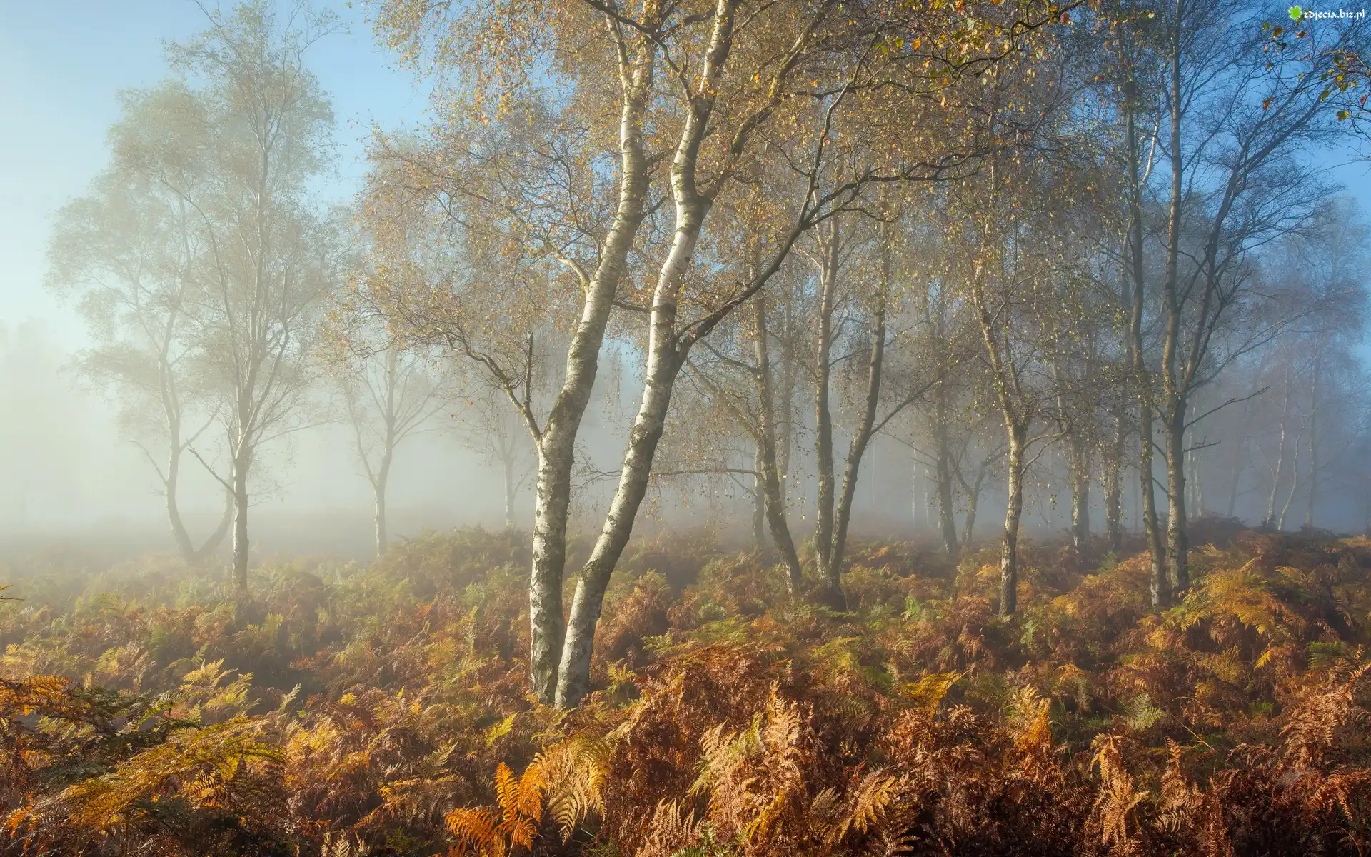 Zdjęcie Jesień, Mgła, Las, Brzozy, Paprocie