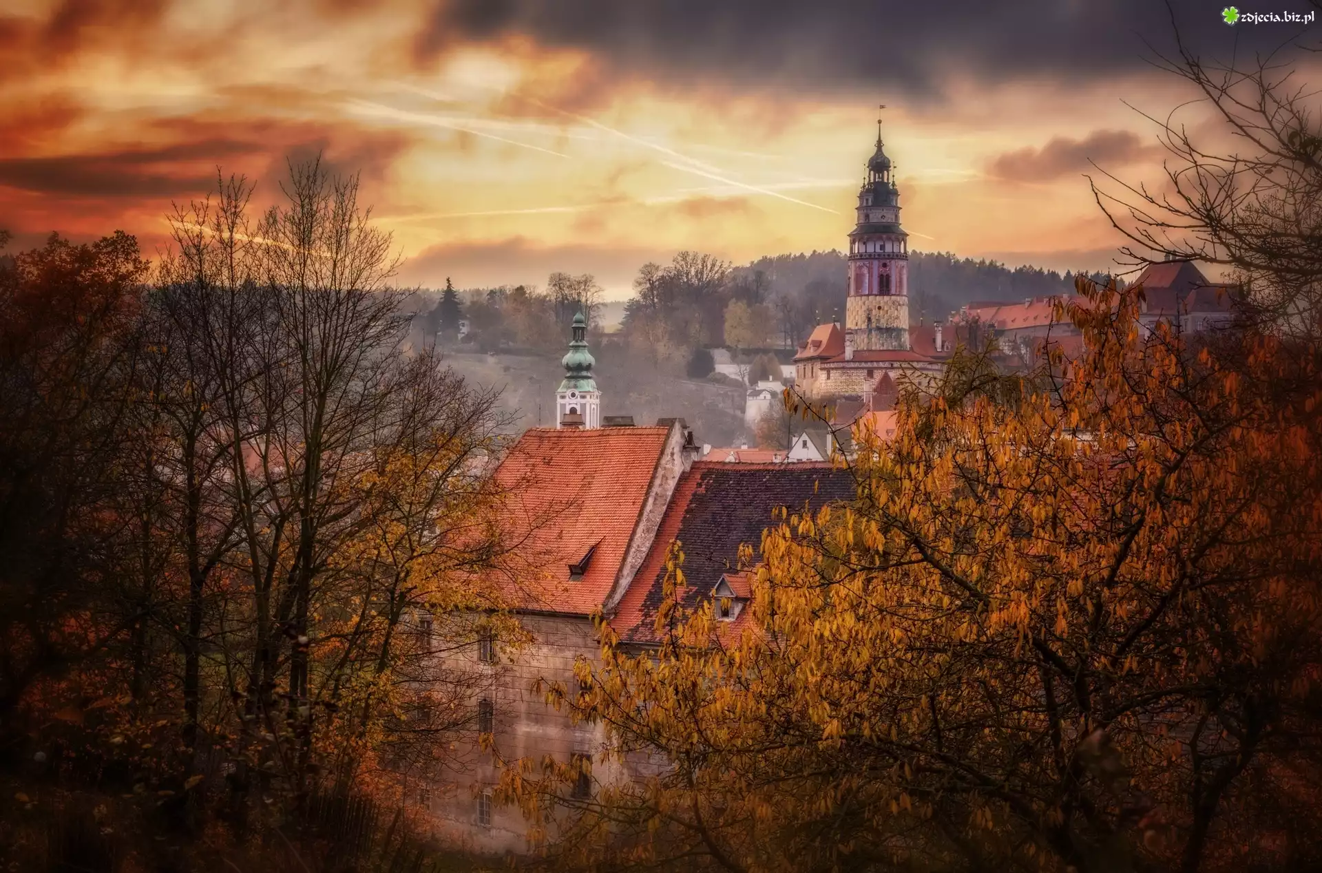 Zdjęcie, Jesień, Drzewa, Mgła, Domy, Kościół