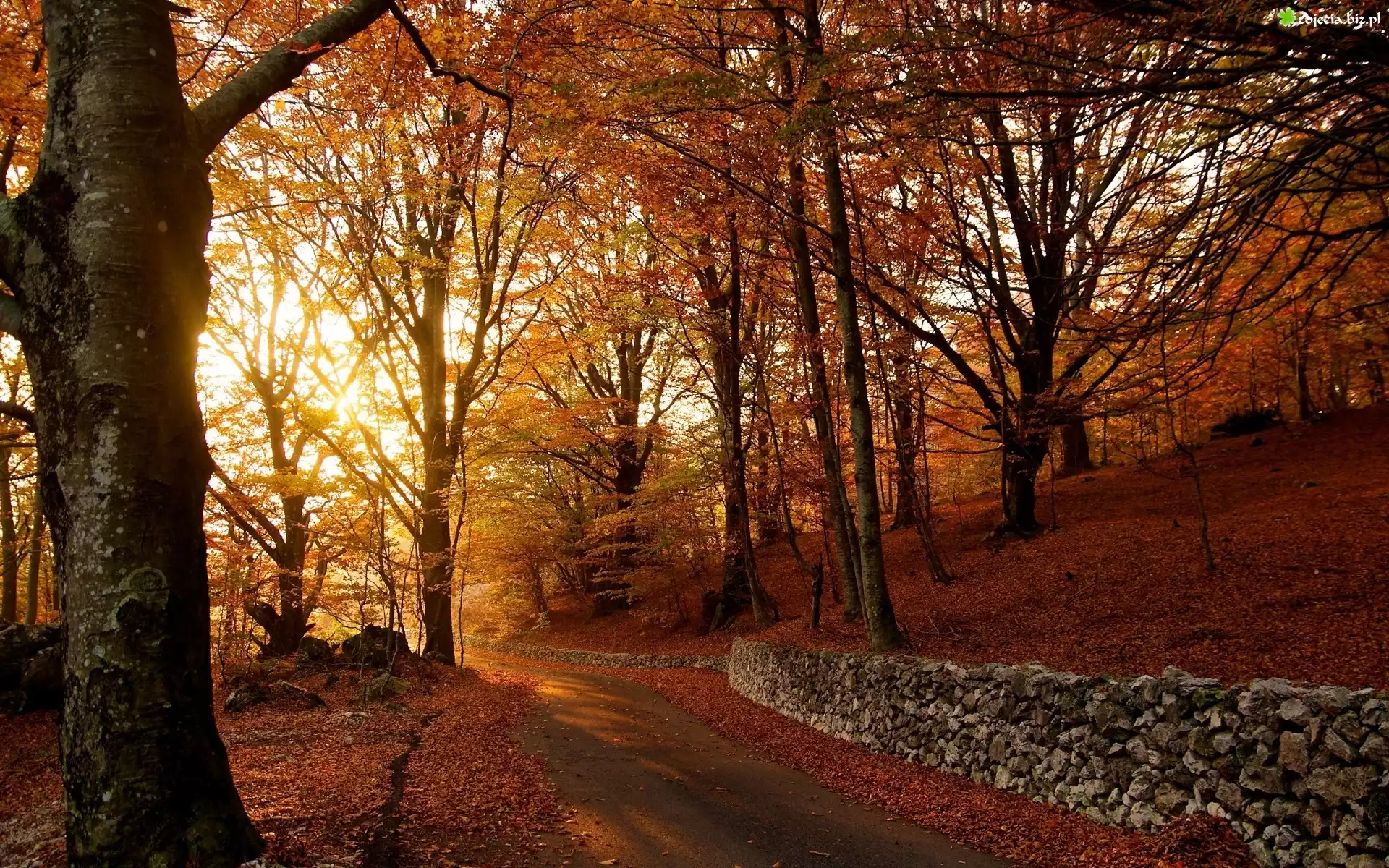 Zdjęcie Jesień, Drzewa, Suche, Liście, Droga, Murek