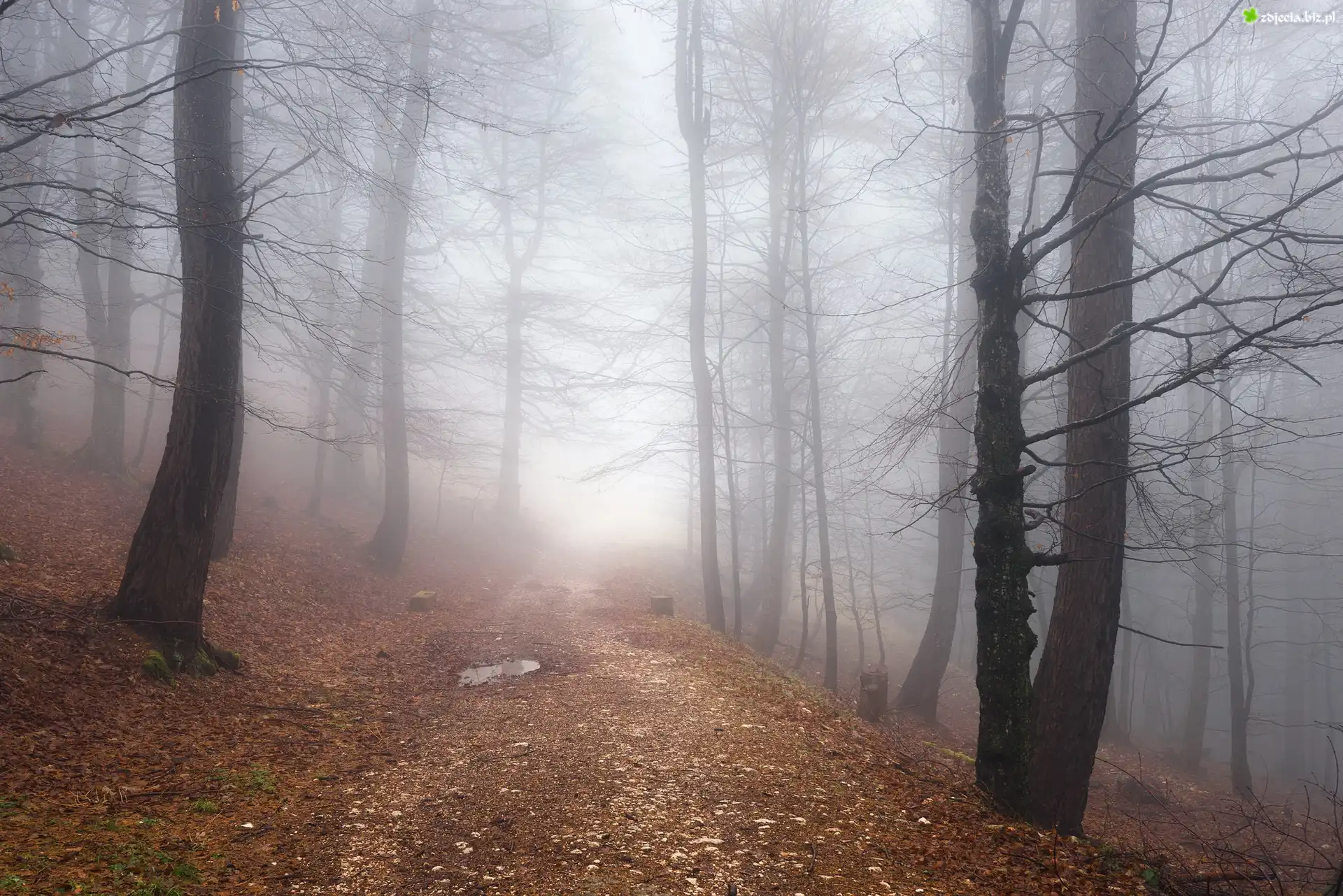Zdjęcie, Jesień, Las, Bezlistne, Drzewa, Mgła