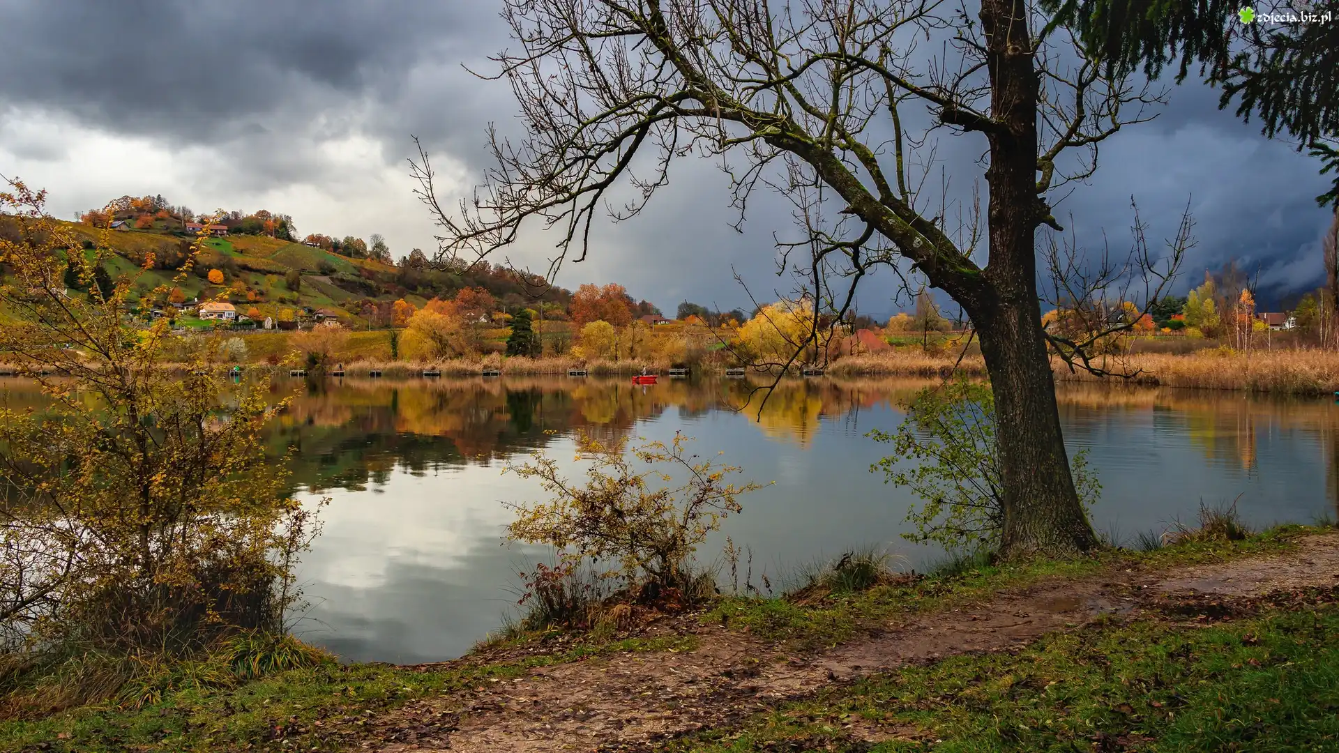 Zdjęcie Jesień, Staw, Łódka, Drzewa, Domy