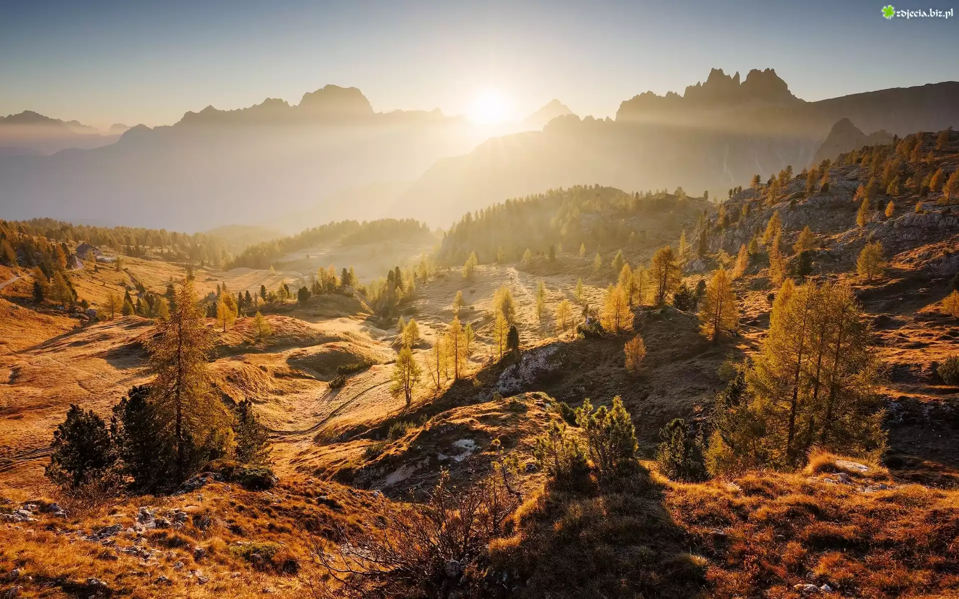 Zdjęcie Góry, Dolomity, Włochy, Jesień, Roślinność, Drzewa