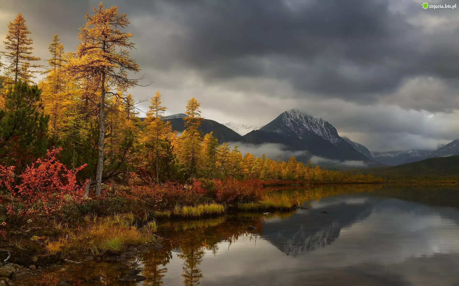 Zdjęcie Jesień, Wzgórza, Góry Kołymskie, Jezioro Nevidimka, Drzewa, Roślinność, Odbicie, Chmury, Kołyma, Magadan, Rosja |