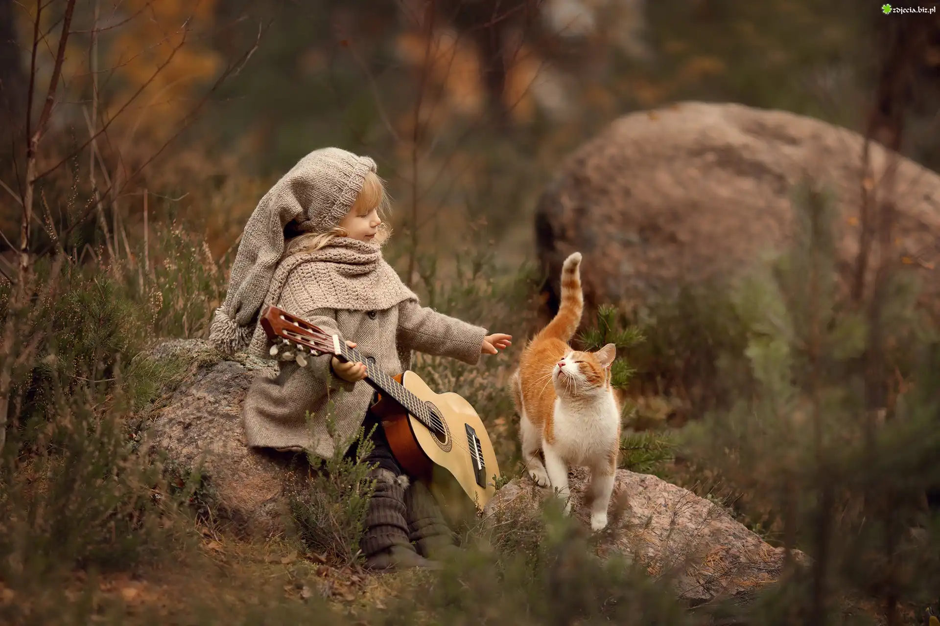 Zdjęcie, Jesień, Dziewczynka, Gitara, Kot, Kamienie