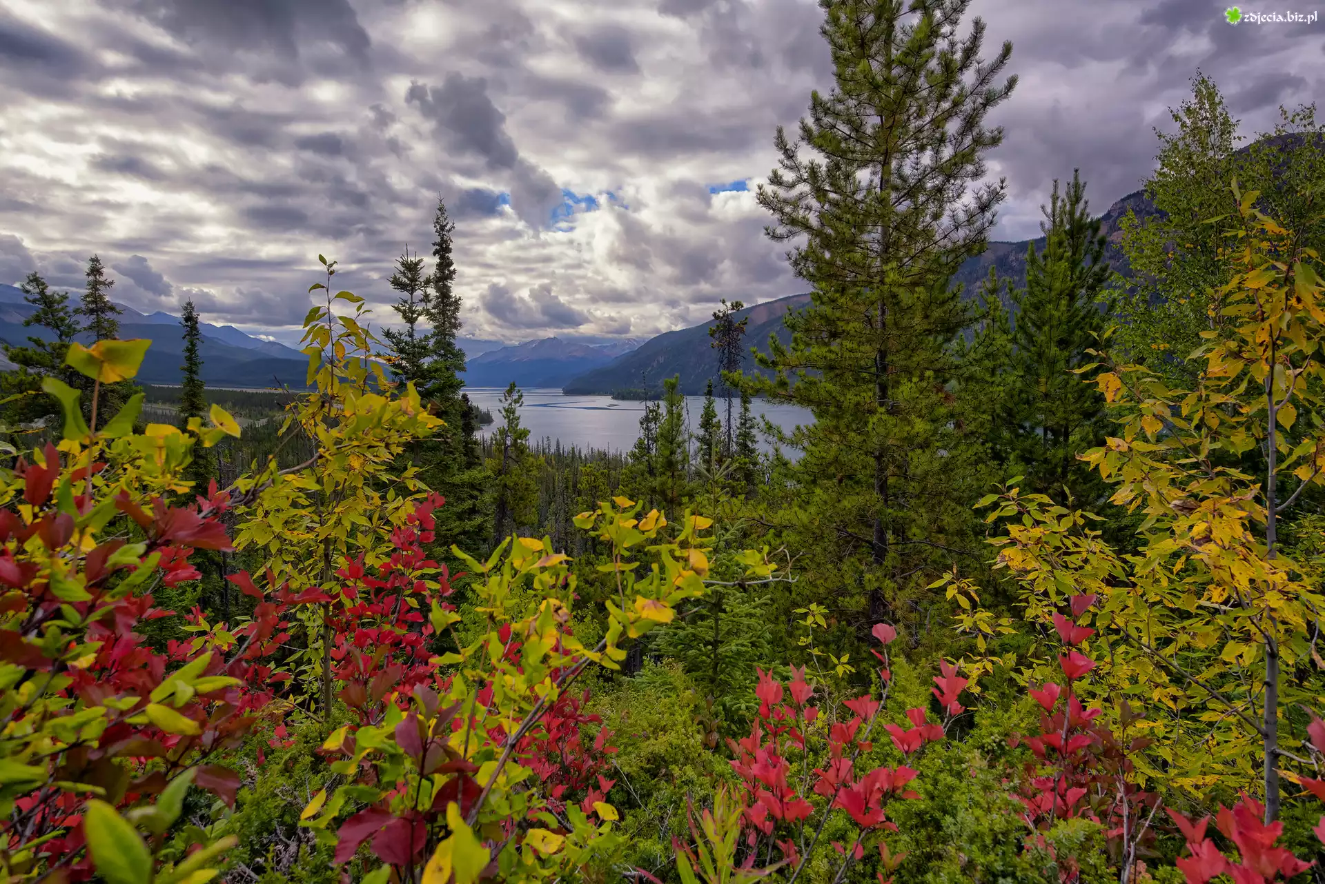 Zdjęcie Jesień, Kolorowe, Drzewa, Liście, Jezioro, Muncho Lake, Góry, Kanada