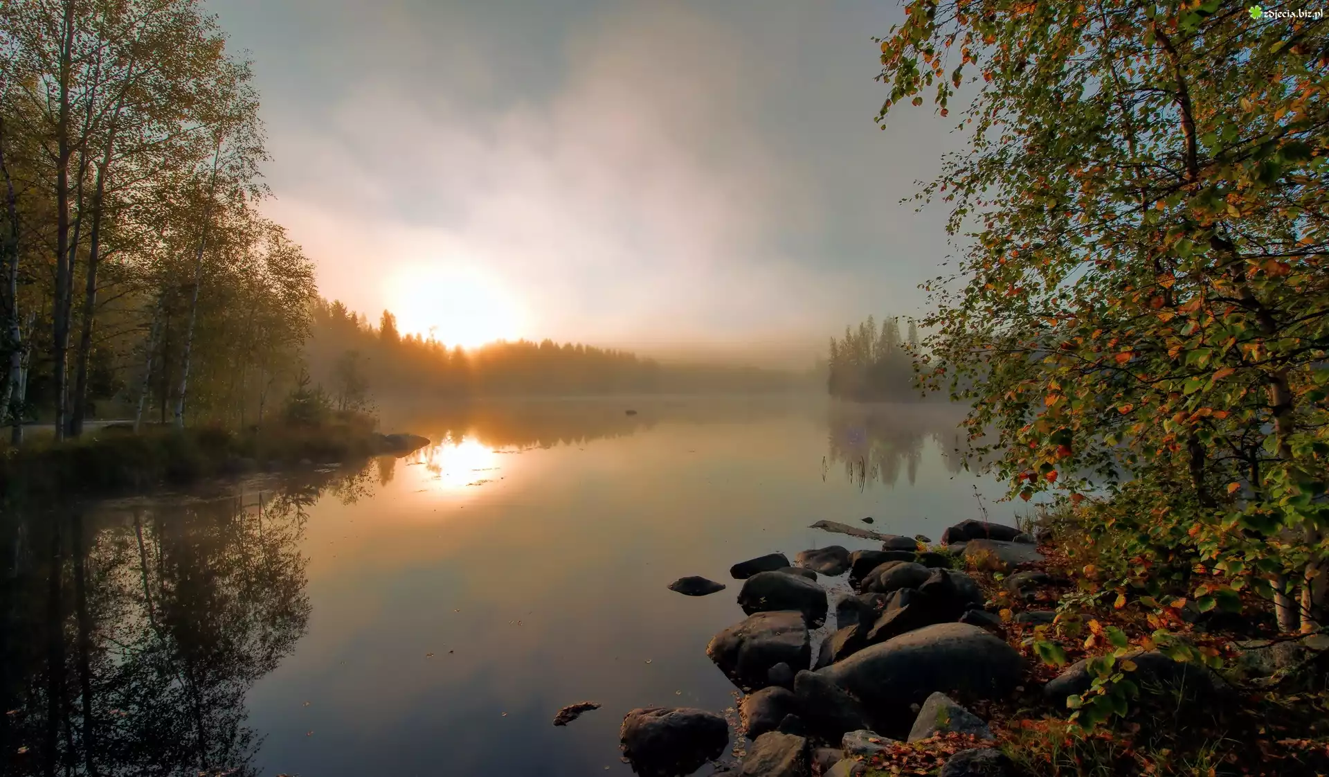 Zdjęcie, Jesień, Świt, Jezioro, Las, Mgła