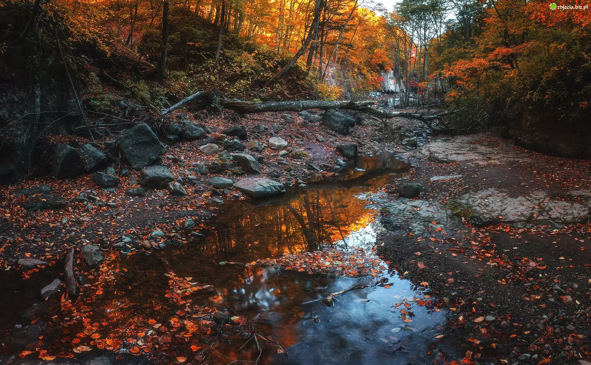 Zdjęcie  Jesień, Las, Drzewa, Rzeczka, Strumyk, Kamienie, Liście
