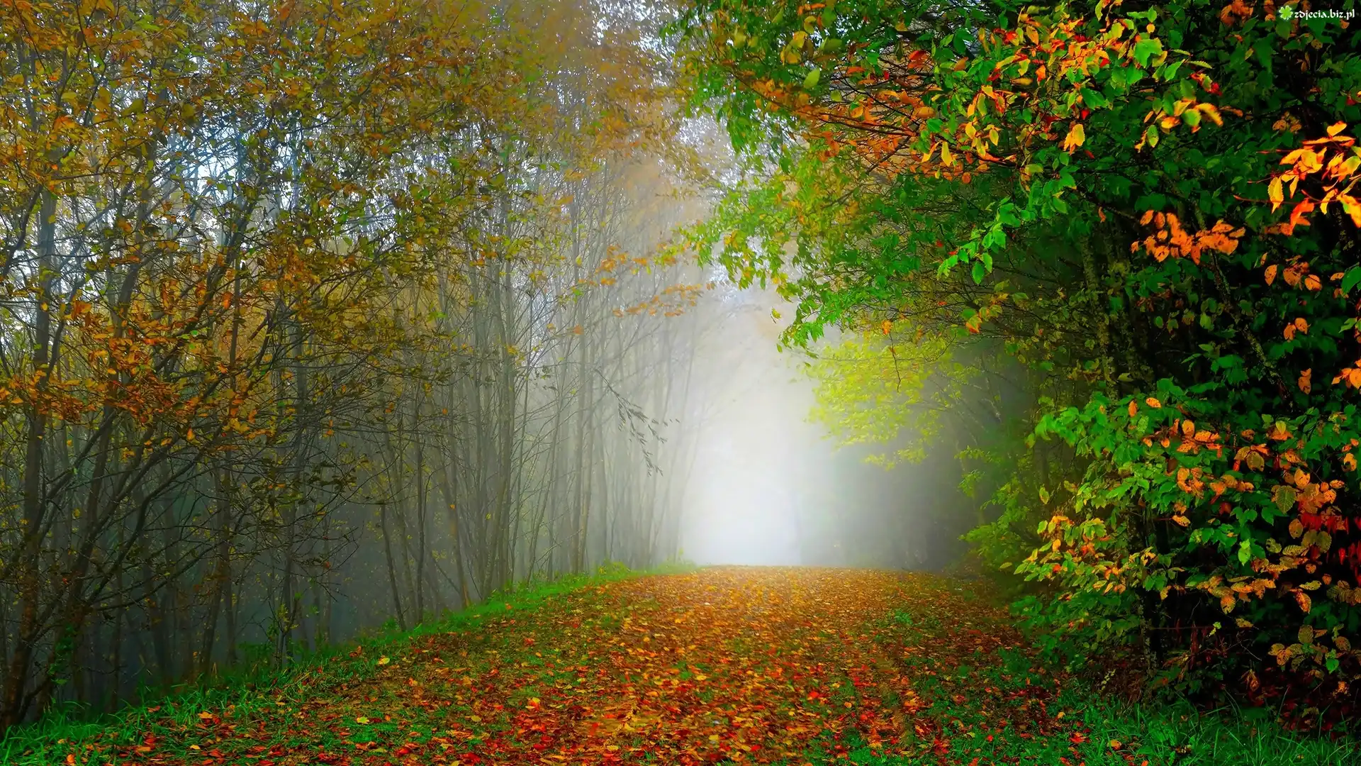 Zdjęcie Jesień, Las, Droga, Liście, Mgła