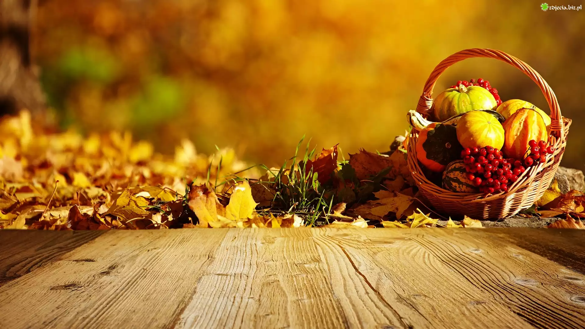 Zdjęcie Jesień, Koszyk, Dynie, Jarzębina, Liście, Deski