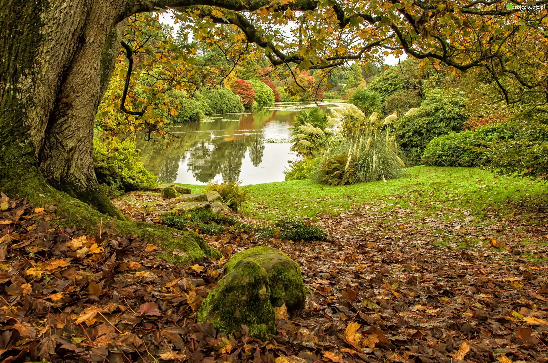 Zdjęcie, Jesień, Drzewa, Krzewy, Liście, Staw