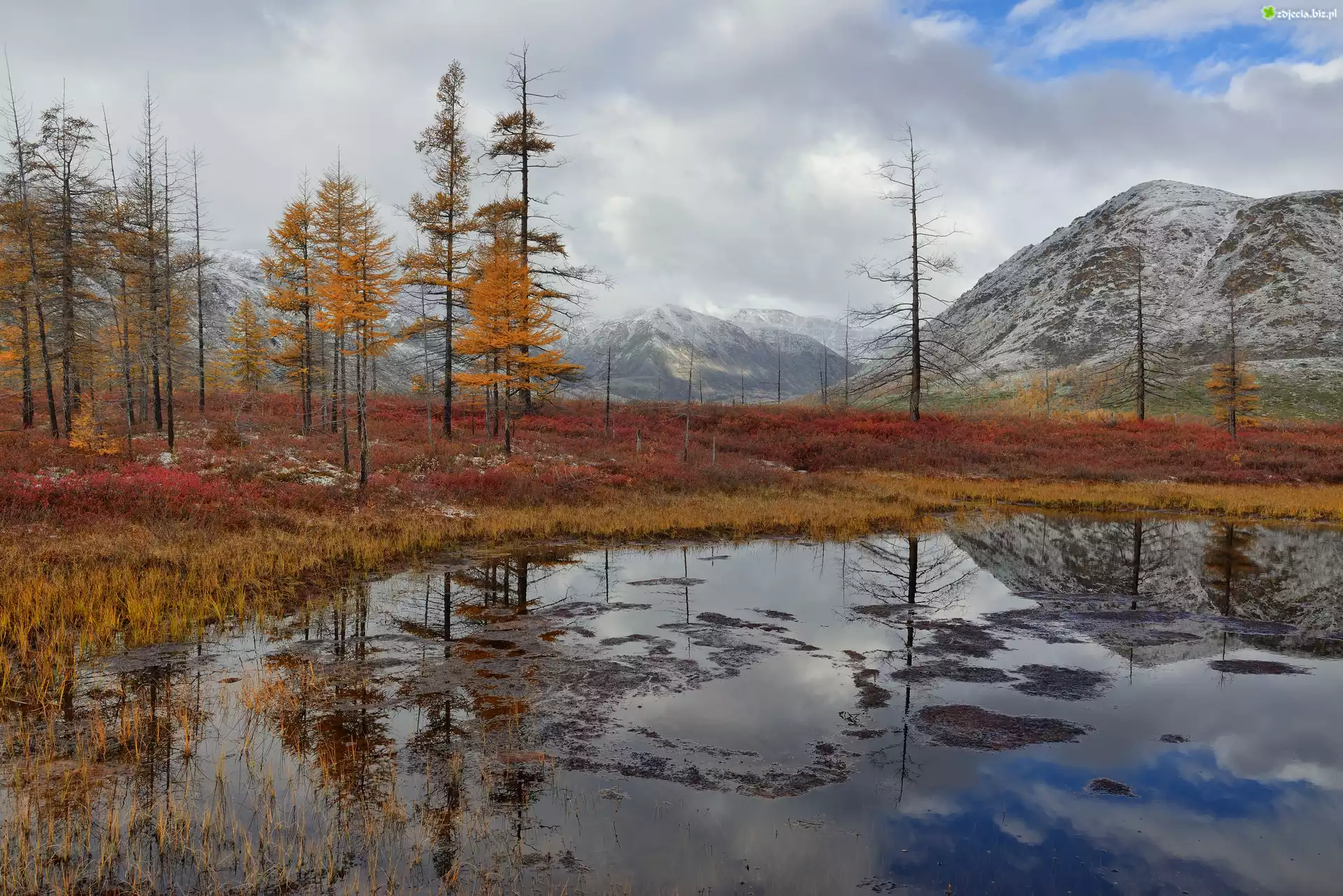 Zdjęcie Jesień, Jezioro Jack London, Góry Kołymskie, Drzewa, Mgła, Rośliny, Kamienie, Odbicie, Kołyma, Obwód magadański, Rosja |