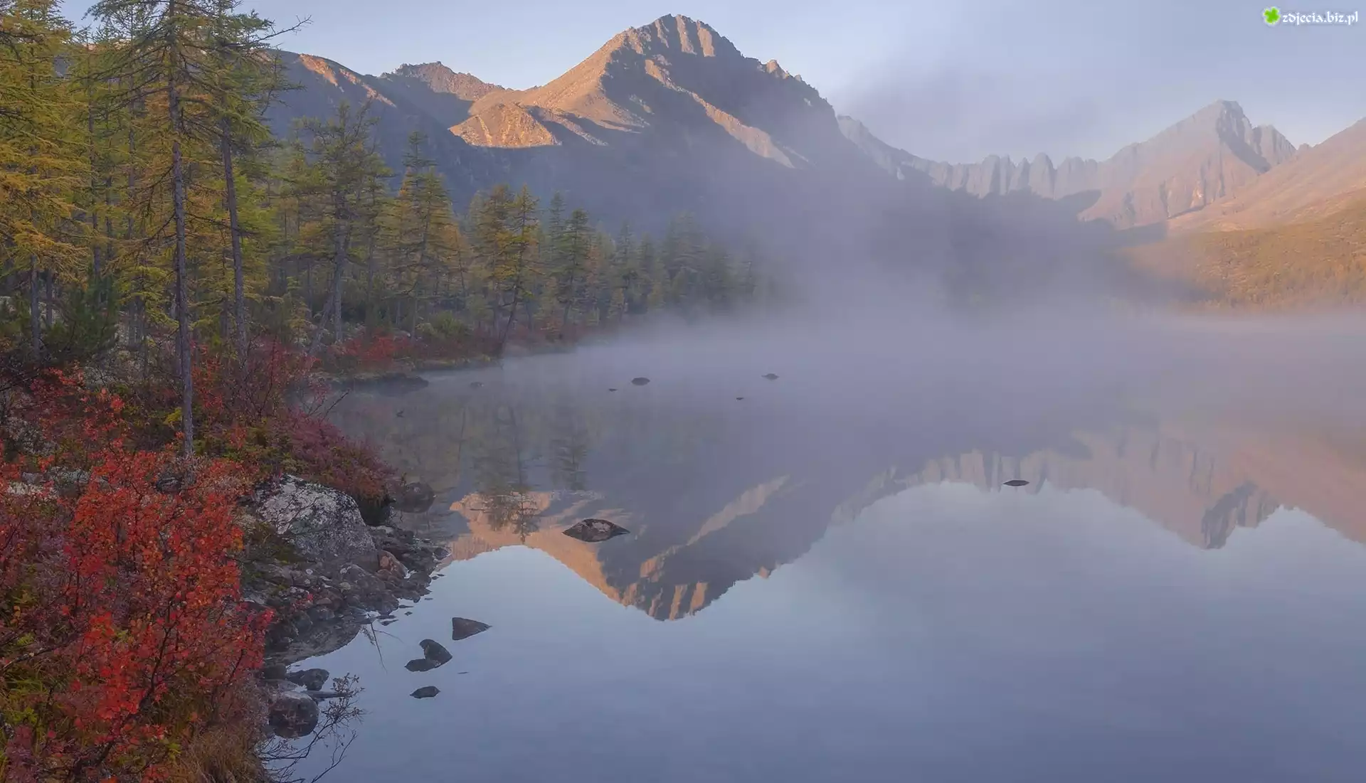 Zdjęcie Jesień, Jezioro Jack London, Mgła, Drzewa, Krzewy, Odbicie, Góra Angachak, Góry Kołymskie, Kołyma, Obwód magadański, Rosja |