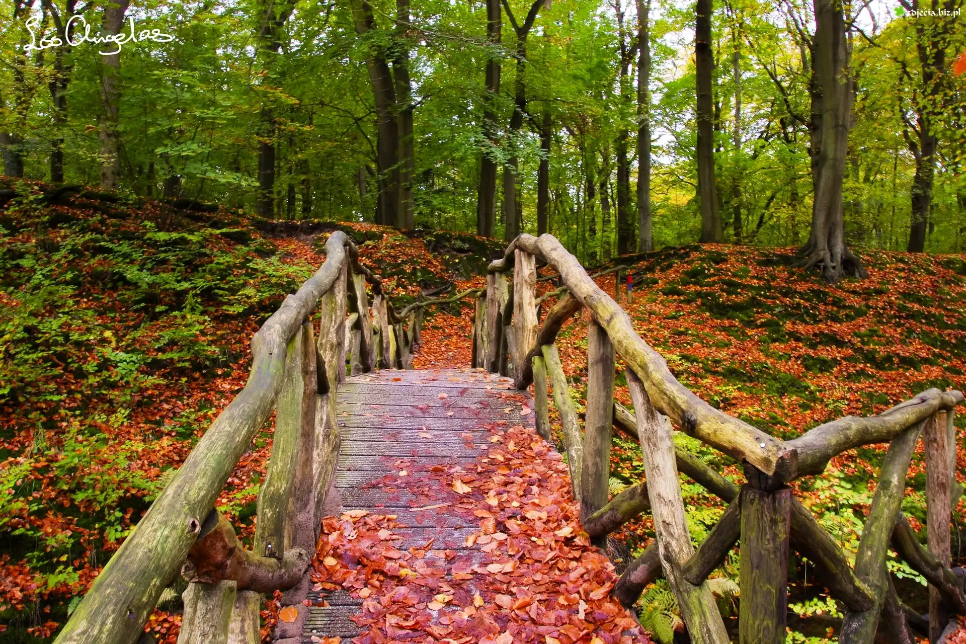 Zdjęcie Jesień, Las, Liście, Most, Mchy, Paprocie