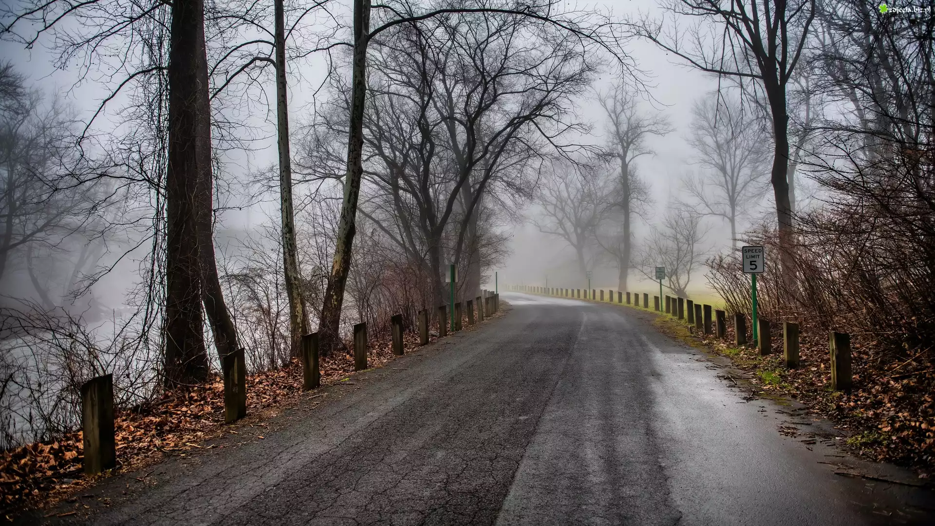 Zdjęcie, Jesień, Droga, Bezlistne, Drzewa, Opadłe, Liście, Mgła, Przydrożne, Słupki