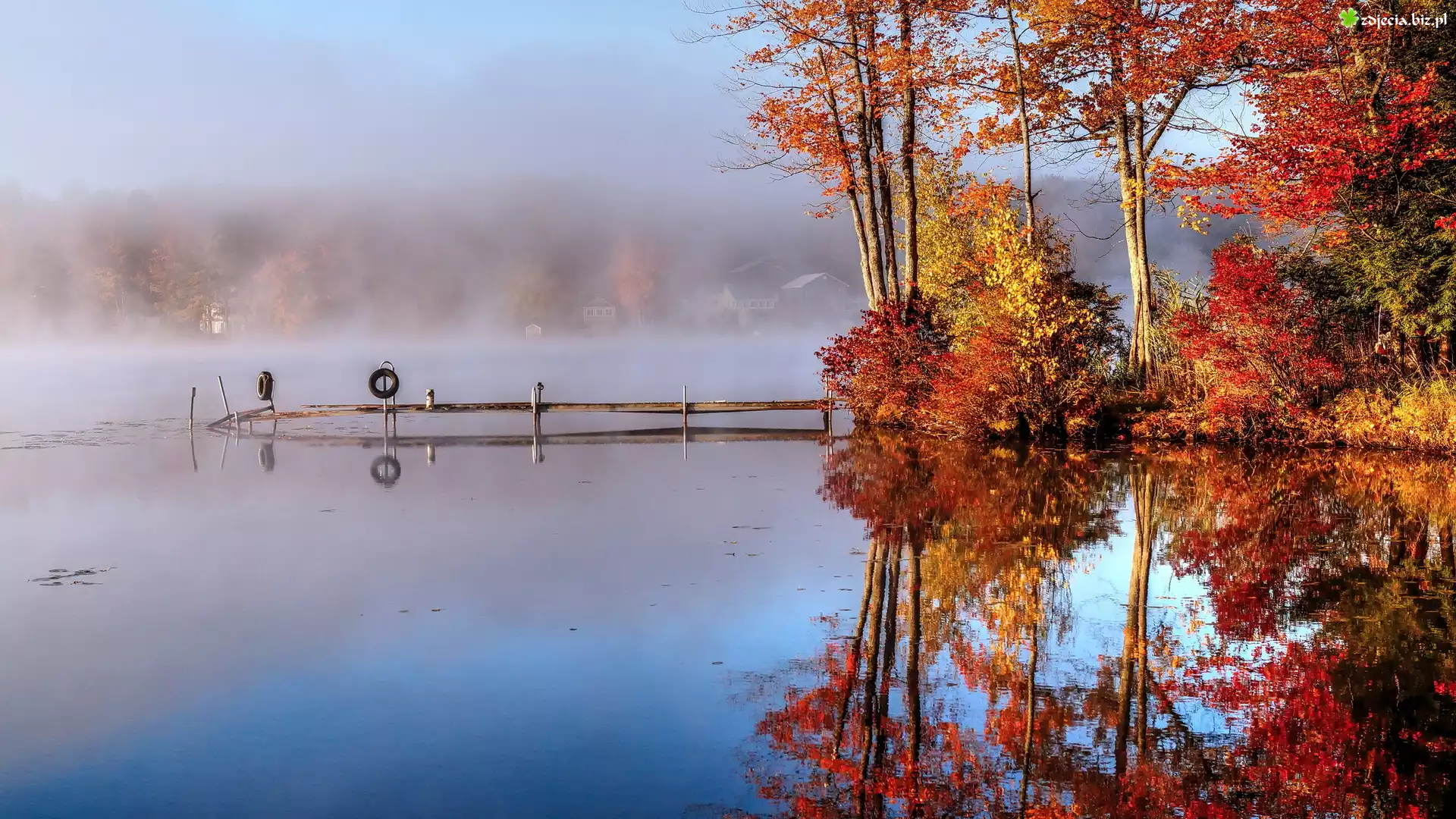 Zdjęcie Jesień, Jezioro, Pomost, Mgła, Drzewa