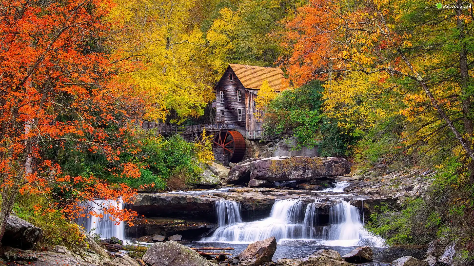 Zdjęcie Jesień, Drzewa, Rzeka, Skały, Młyn wodny, Glade Creek Grist Mill, Park Babcock State, Wirginia Zachodnia, Stany Zjednoczone |