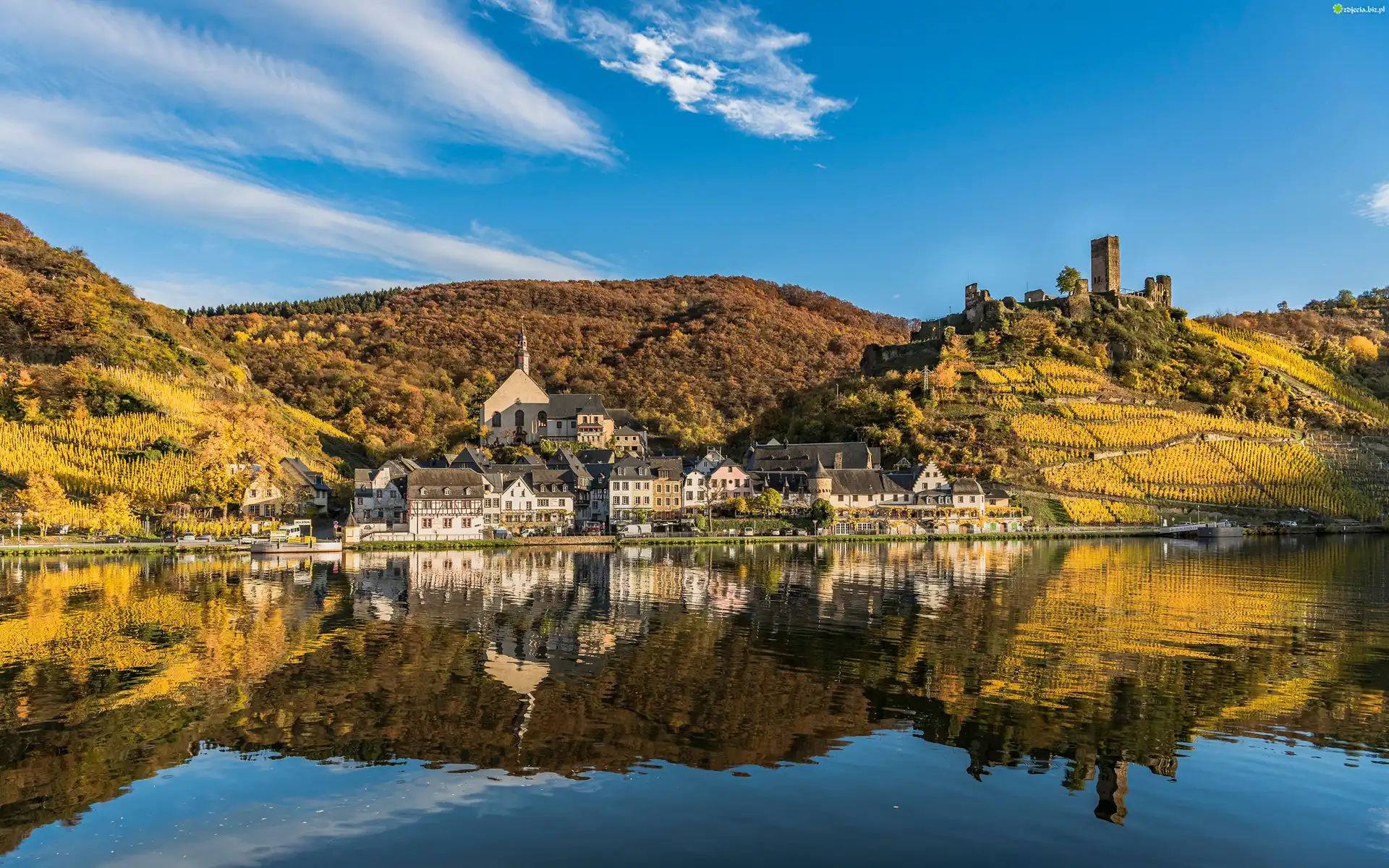 Zdjęcie, Niemcy, Miasto Beilstein, Rzeka Mozela, Wzgórza, Winnice, Drzewa, Domy, Jesień