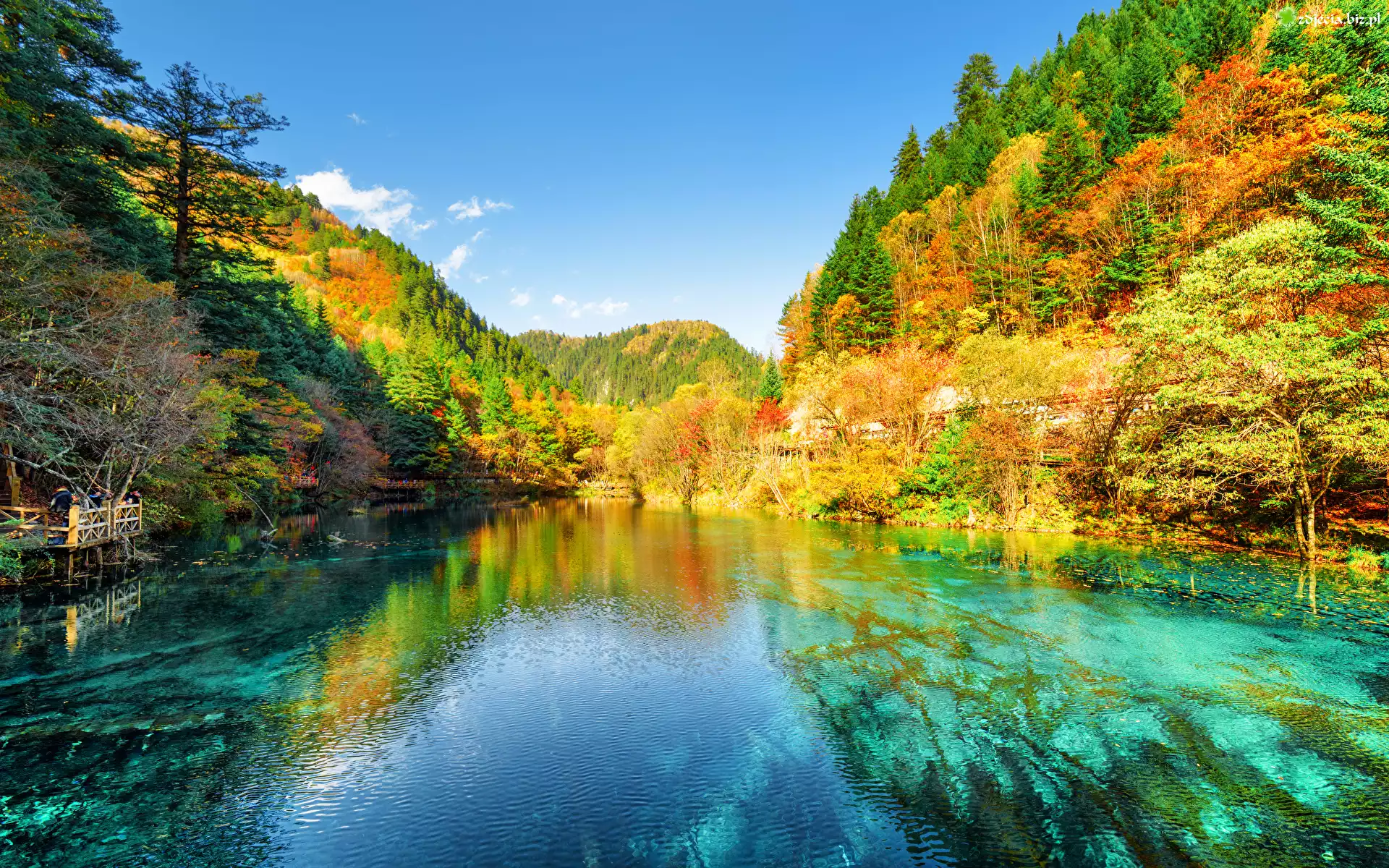Zdjęcie, Chiny, Park Narodowy Jiuzhaigou, Jezioro, Las, Góry, Jesień