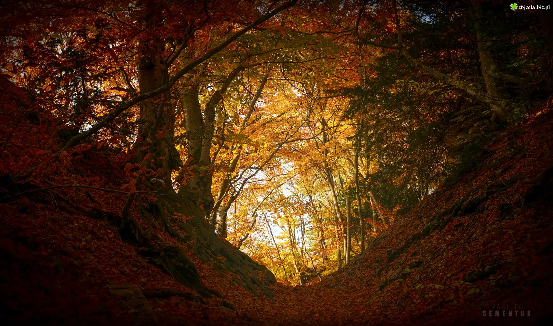 Zdjęcie Jesień, Las, Skarpa, Opadłe, Liście