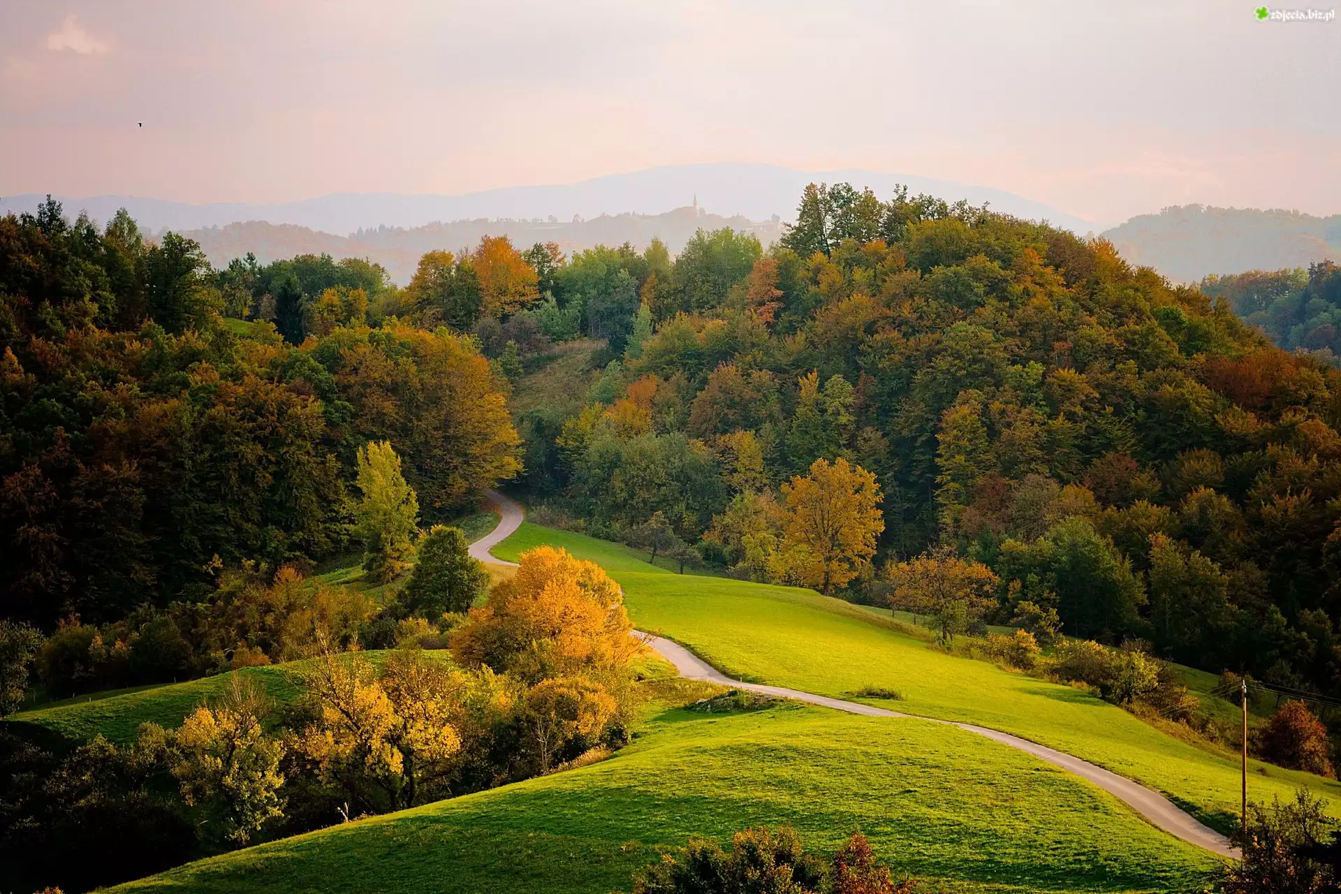 Zdjęcie Jesień, Droga, Drzewa, Pagórki, Krajobraz