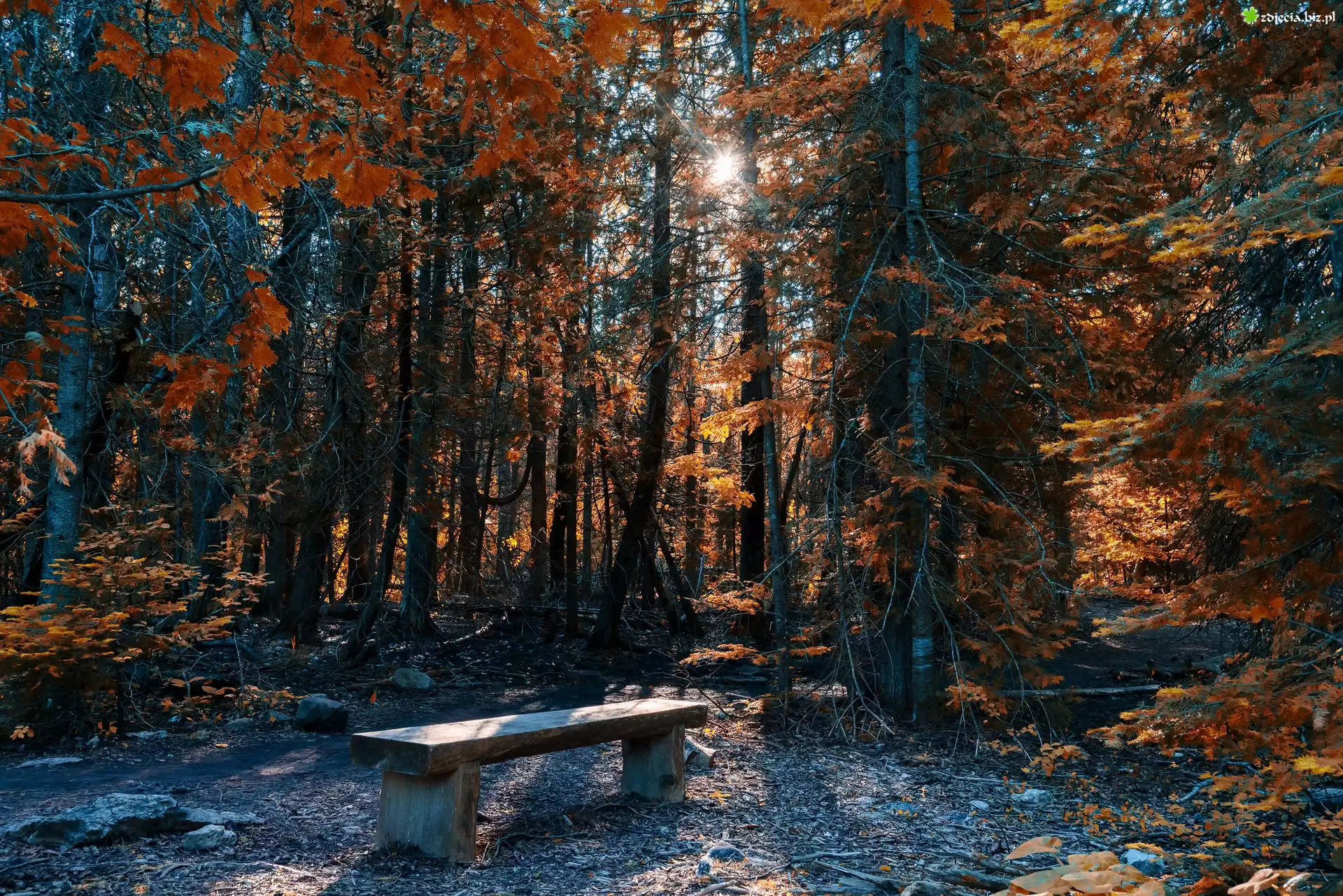 Zdjęcie, Jesień, Las, Drzewa, Ławka, Promienie słońca