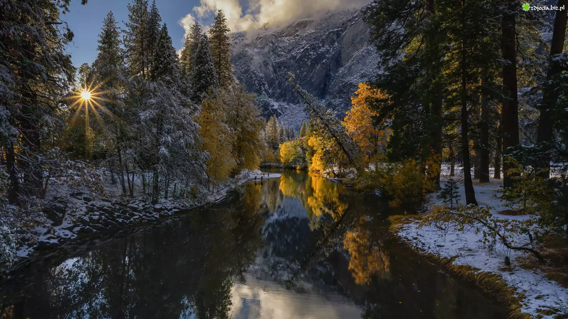 Zdjęcie Jesień, Drzewa, Rzeka, Merced River, Park Narodowy Yosemite, Śnieg, Promienie słońca, Góry, Chmury, Stan Kalifornia, Stany Zjednoczone |