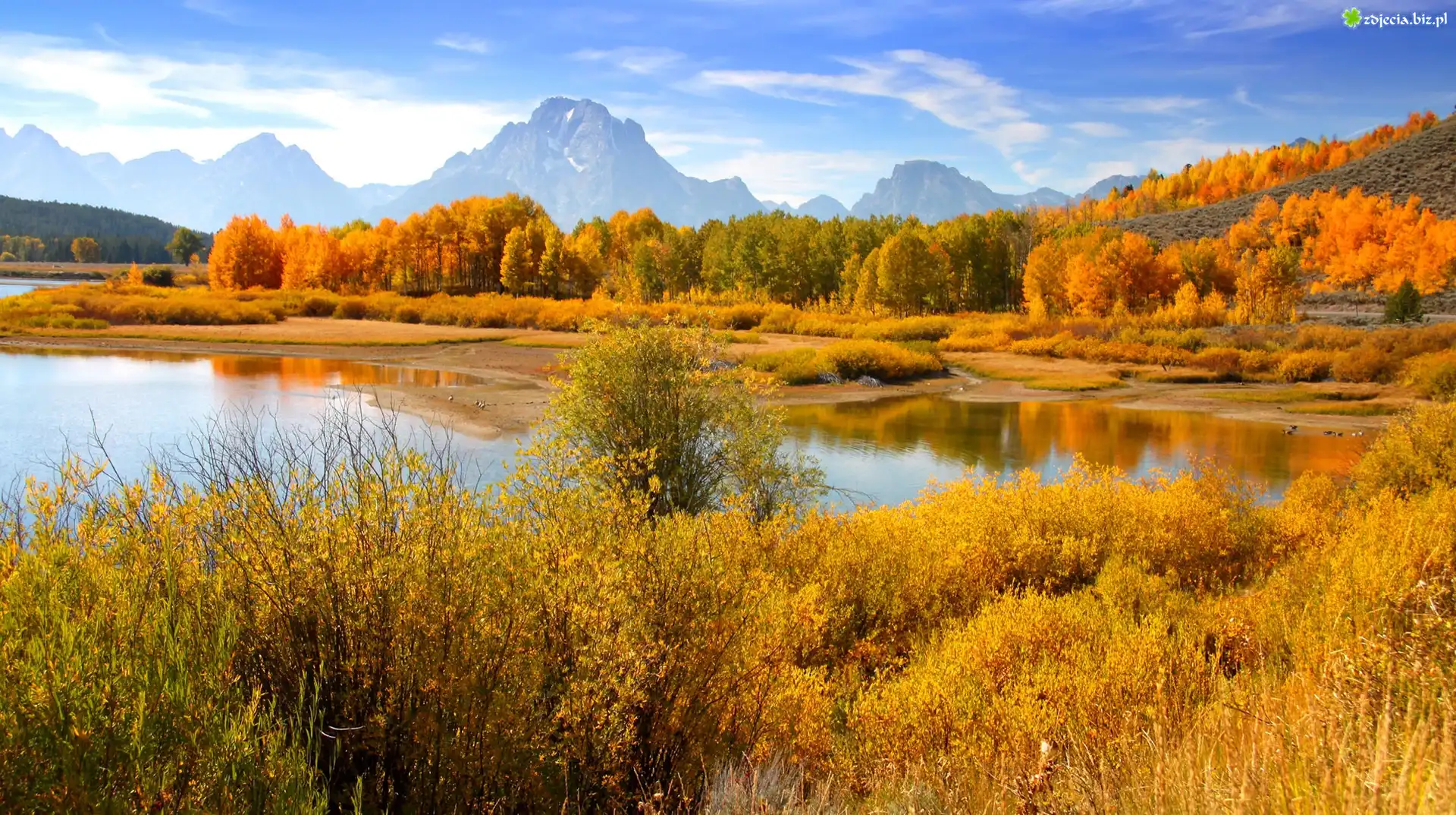 Zdjęcie Jesień, Rzeka, Rozlewisko, Roślinność, Góry