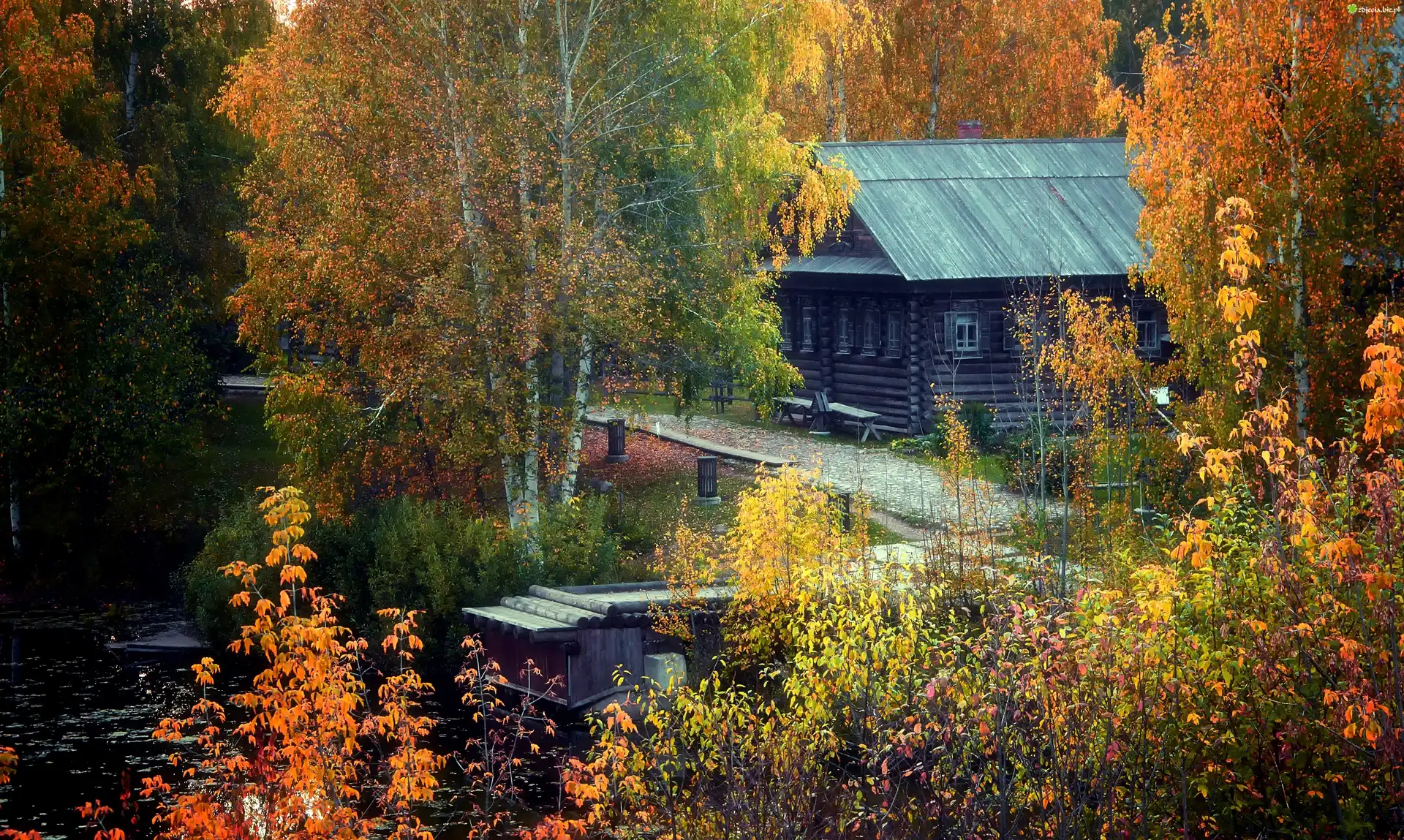 Zdjęcie, Jesień, Dom, Rzeczka, Drzewa
