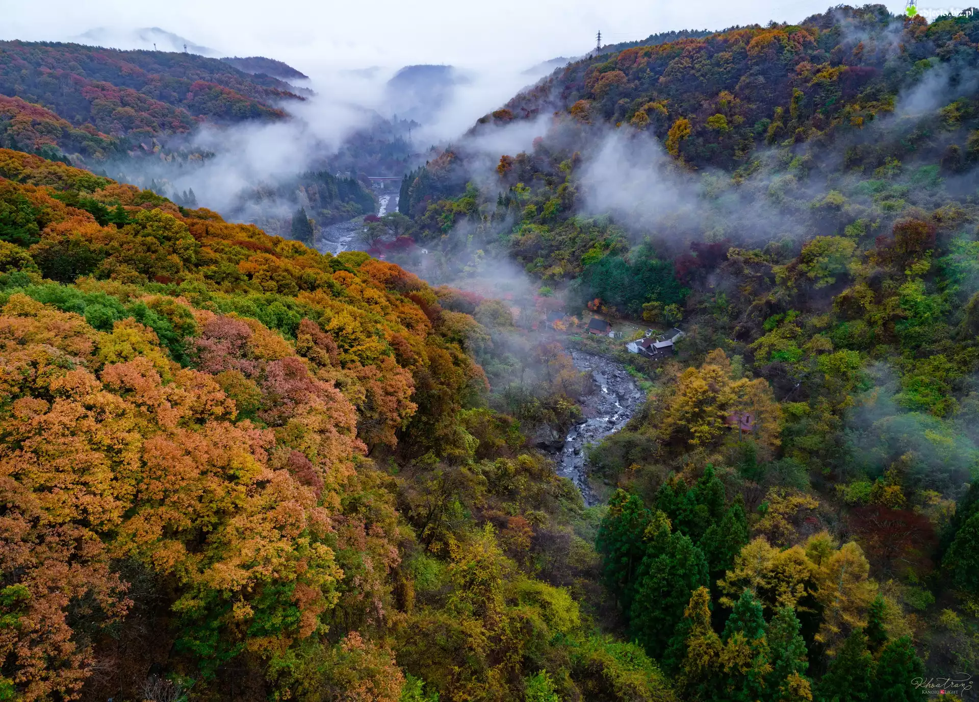 Zdjęcie Jesień, Góry, Las, Kolorowe, Drzewa, Mgła, Rzeka, Nikko, Japonia