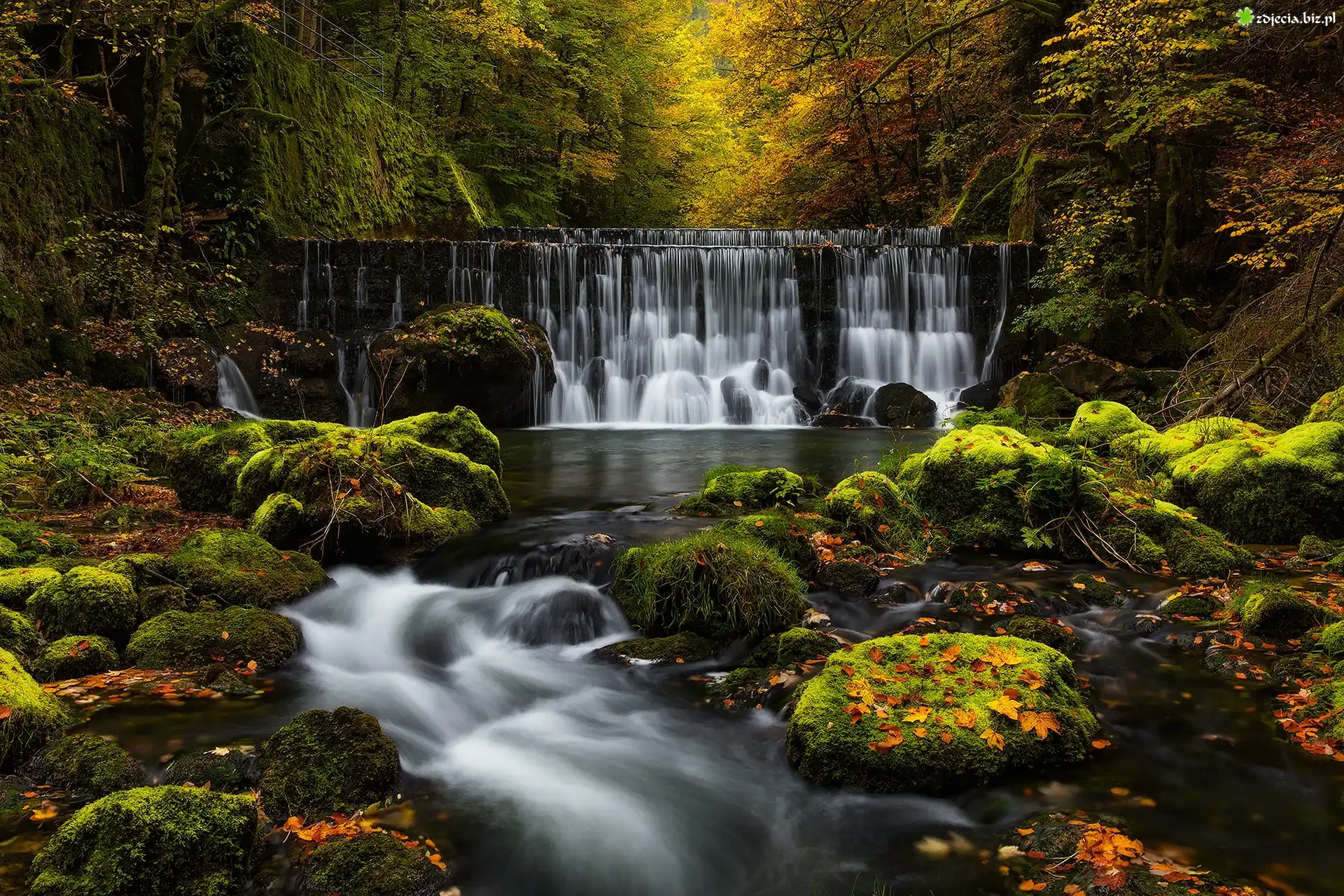 Zdjęcie Las, Wodospad, Skały, Drzewa, Omszone, Kamienie, Potok, Jesień