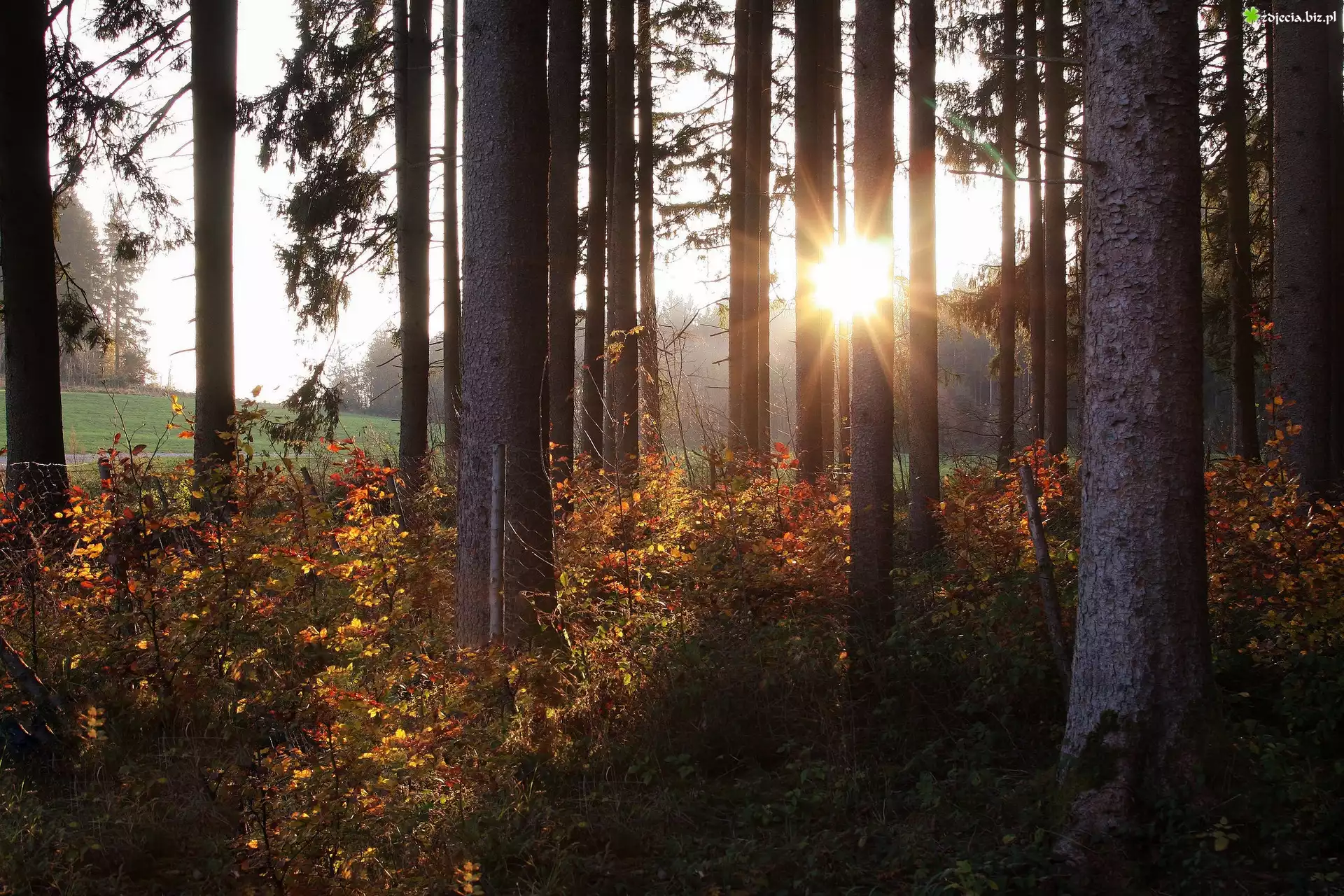 Zdjęcie Jesień, Las, Drzewa, Promienie słońca, Rośliny