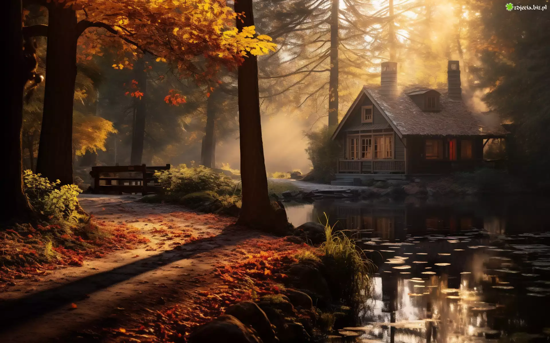 Zdjęcie Jesień, Drzewa, Liście, Dom, Mgła, Ścieżka, Most, Staw, Słoneczny blask