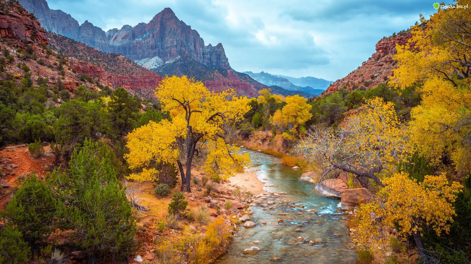 Zdjęcie Jesień, Góry, Góra Watchman, Rzeka, Virgin River, Kamienie, Drzewa, Park Narodowy Zion, Utah, Stany Zjednoczone |