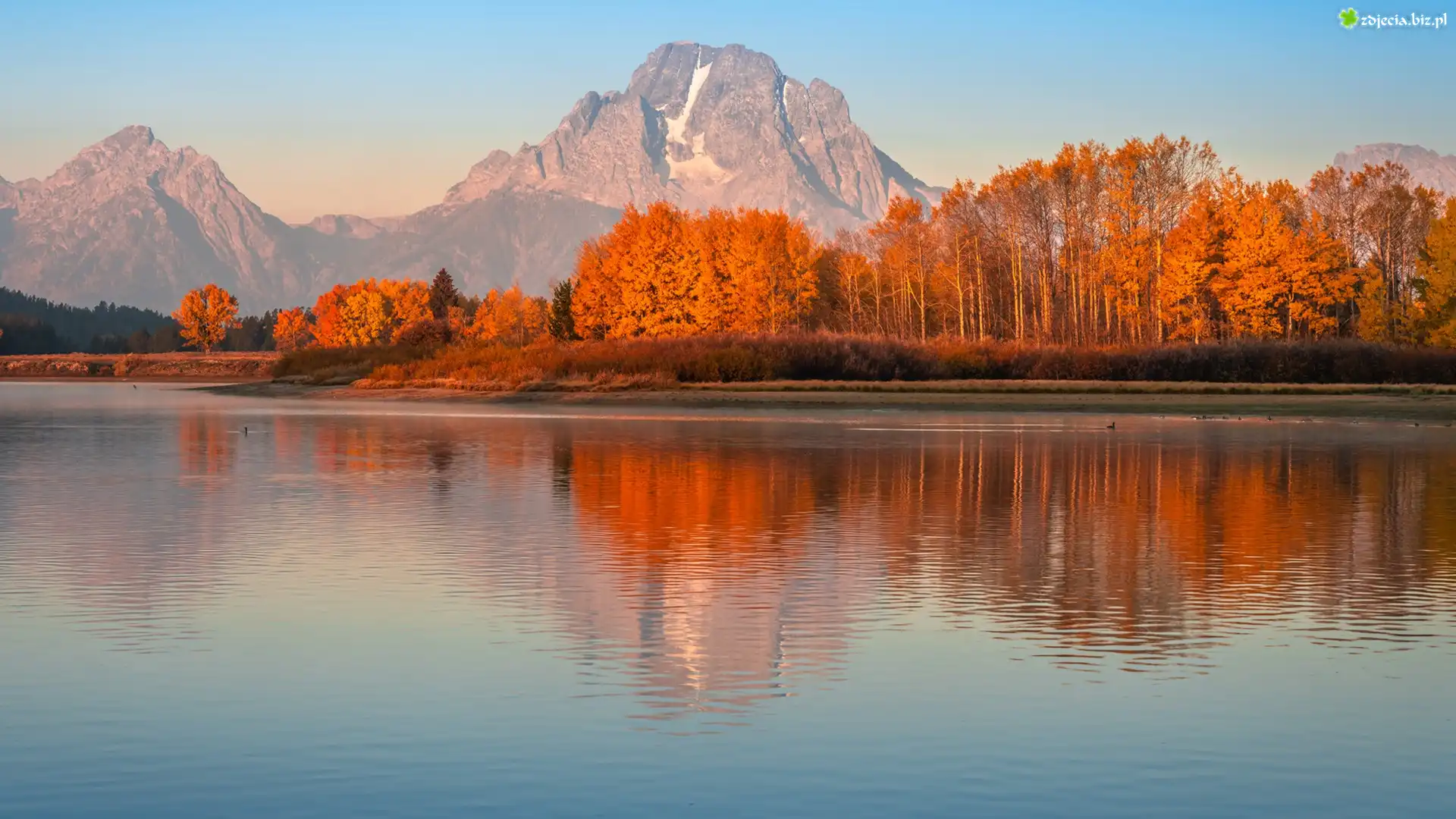 Zdjęcie Jesień, Park Narodowy Grand Teton, Rzeka, Snake River, Góry, Teton Range, Drzewa, Jesień, Stan Wyoming, Stany Zjednoczone |