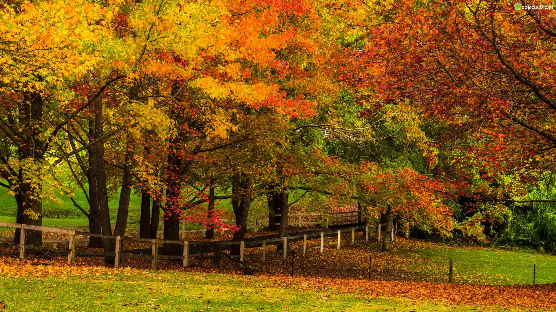 Zdjęcie, Jesień, Drzewa, Ogrodzenie, Trawa, Liście