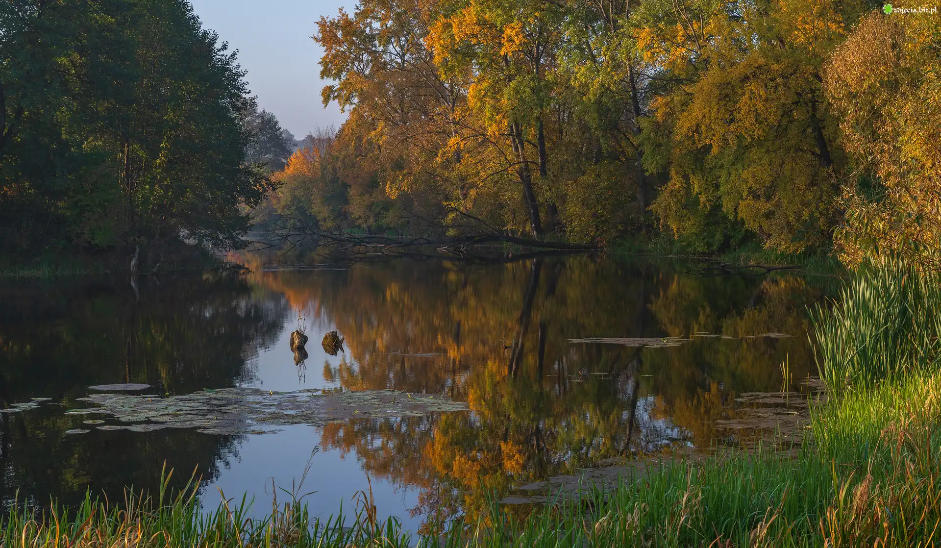Zdjęcie Jesień, Rzeka, Drzewa, Trawy, Trzciny